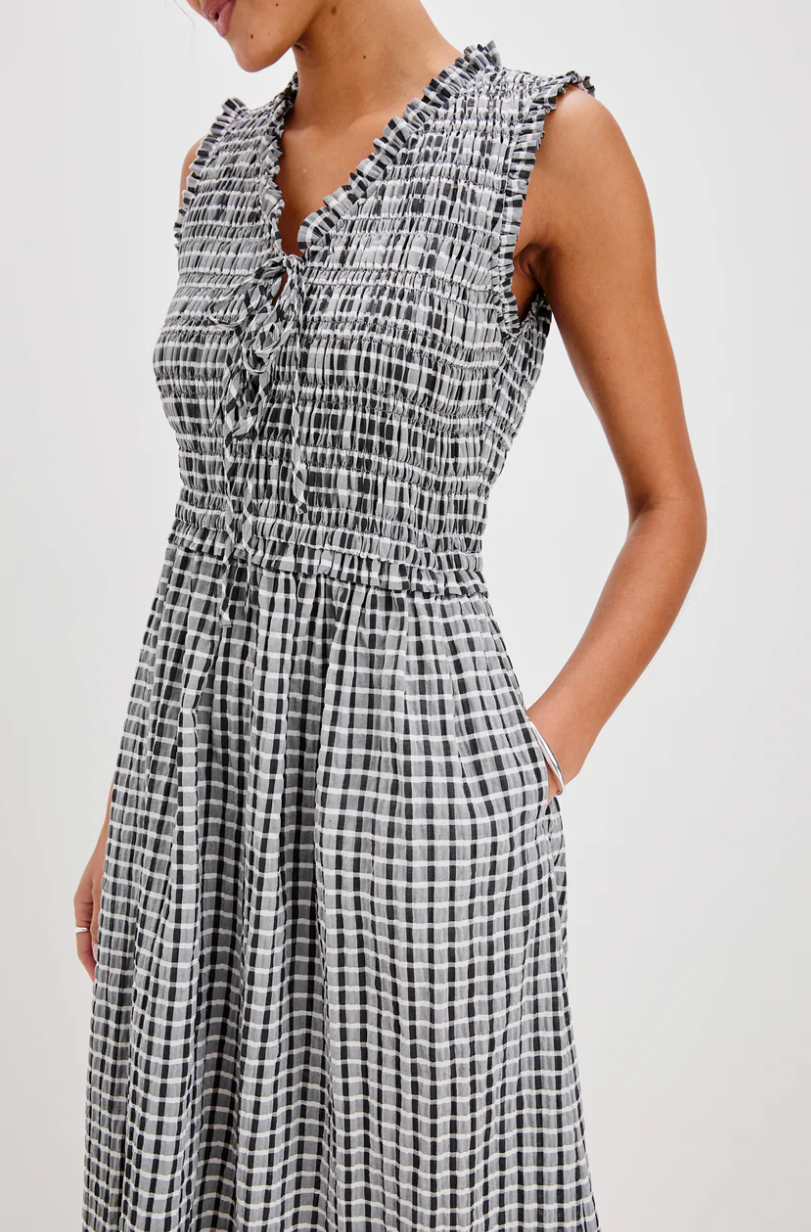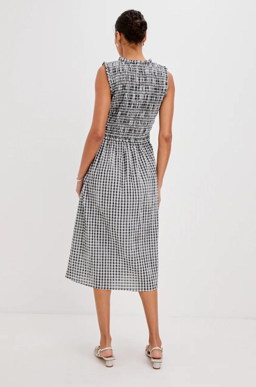 Crafted in a lightweight textured gingham fabric, the Adine midi dress features a fitted bodice, full skirt, and easy-wearing silhouette with feminine details.