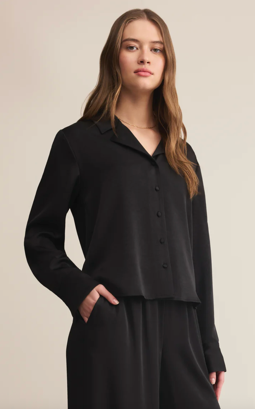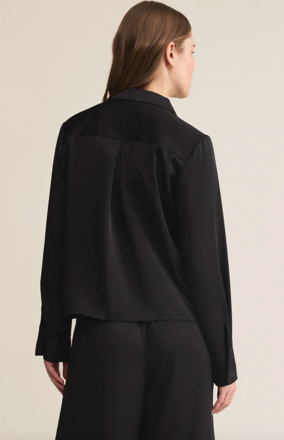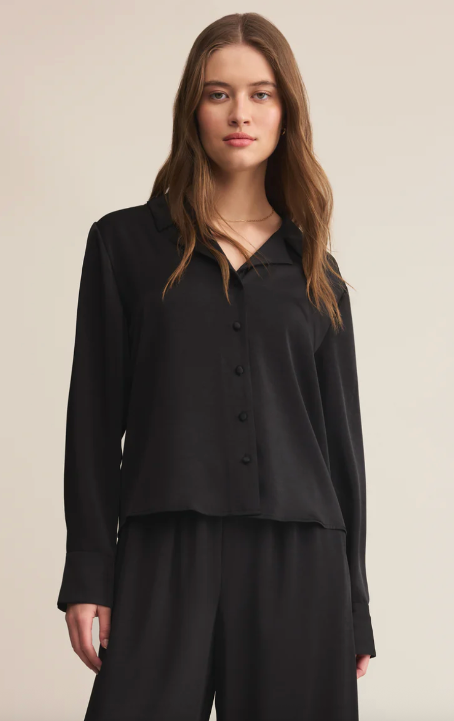 This luxe satin top offers a relaxed fit with a collared neckline and button-front design. Its fluid drape and understated sheen make it a versatile staple for workdays or nights out.