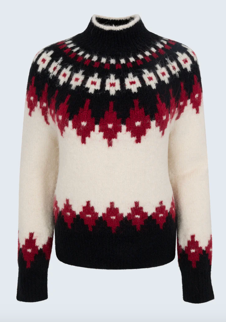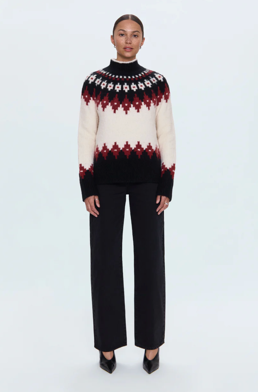 A modern update to a heritage knit, Astrid reimagines the classic Fair Isle with bold contrast tones and an easy pullover fit that feels equal parts cozy and refined. Crafted from a soft, substantial blend of acrylic, wool, alpaca, and nylon. White Oxblood Fair Isle brings a graphic contrast that transitions effortlessly from après-ski to city days.