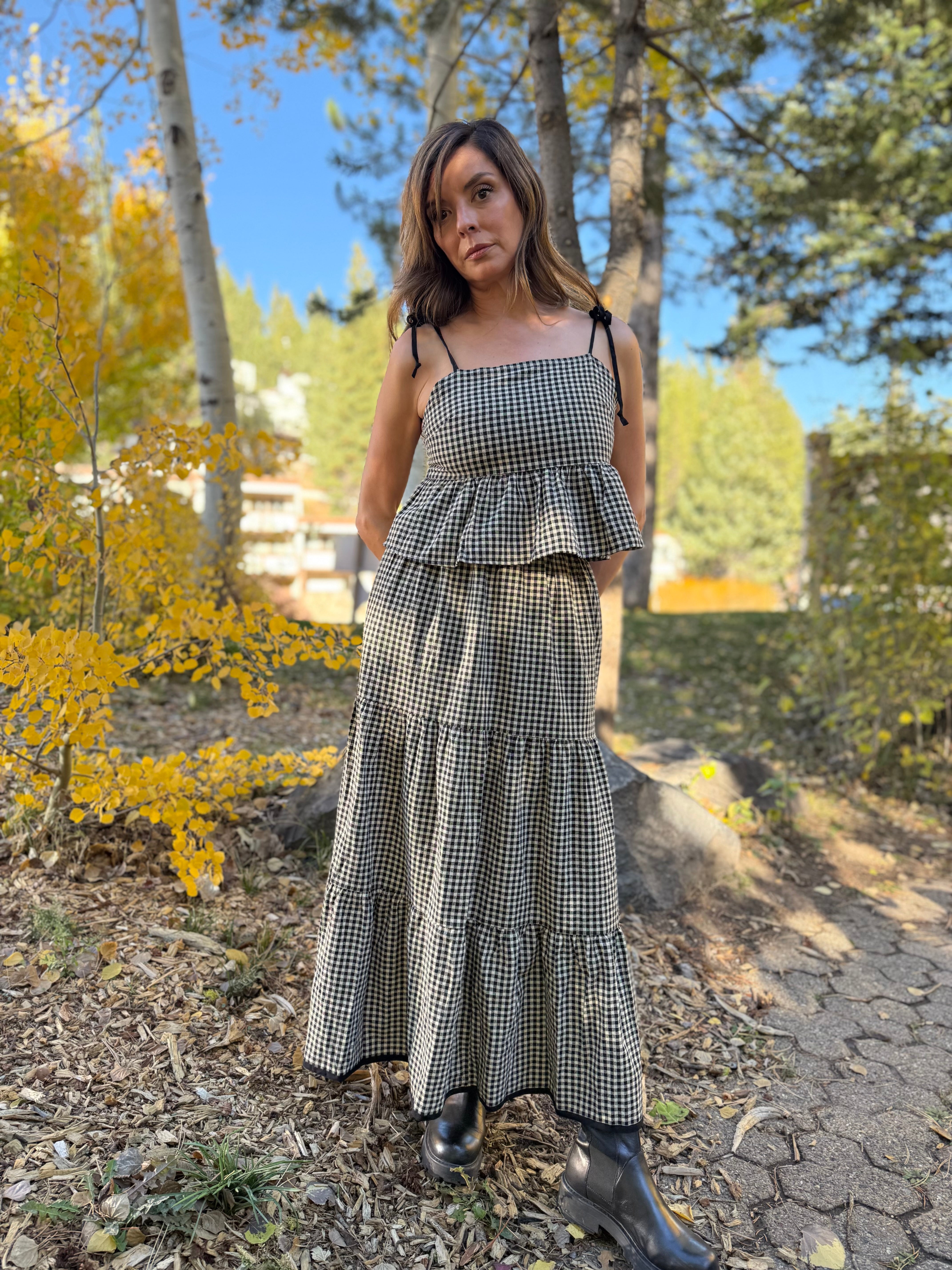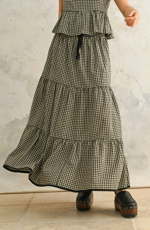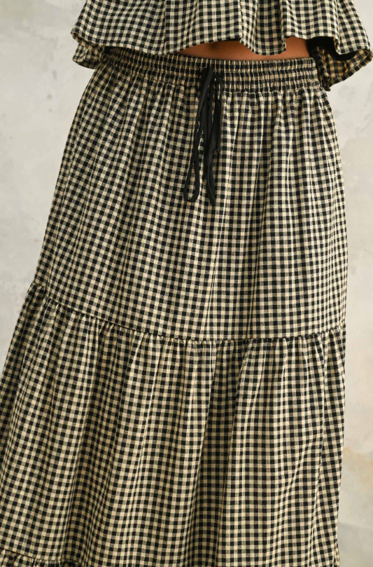 The Aurelia Gingham Skirt features a stylish tiered design with a classic gingham pattern and a comfortable drawstring waist with tie for a customizable fit. Pair it with the matching top for a coordinated and chic look.