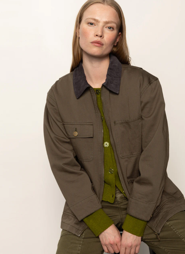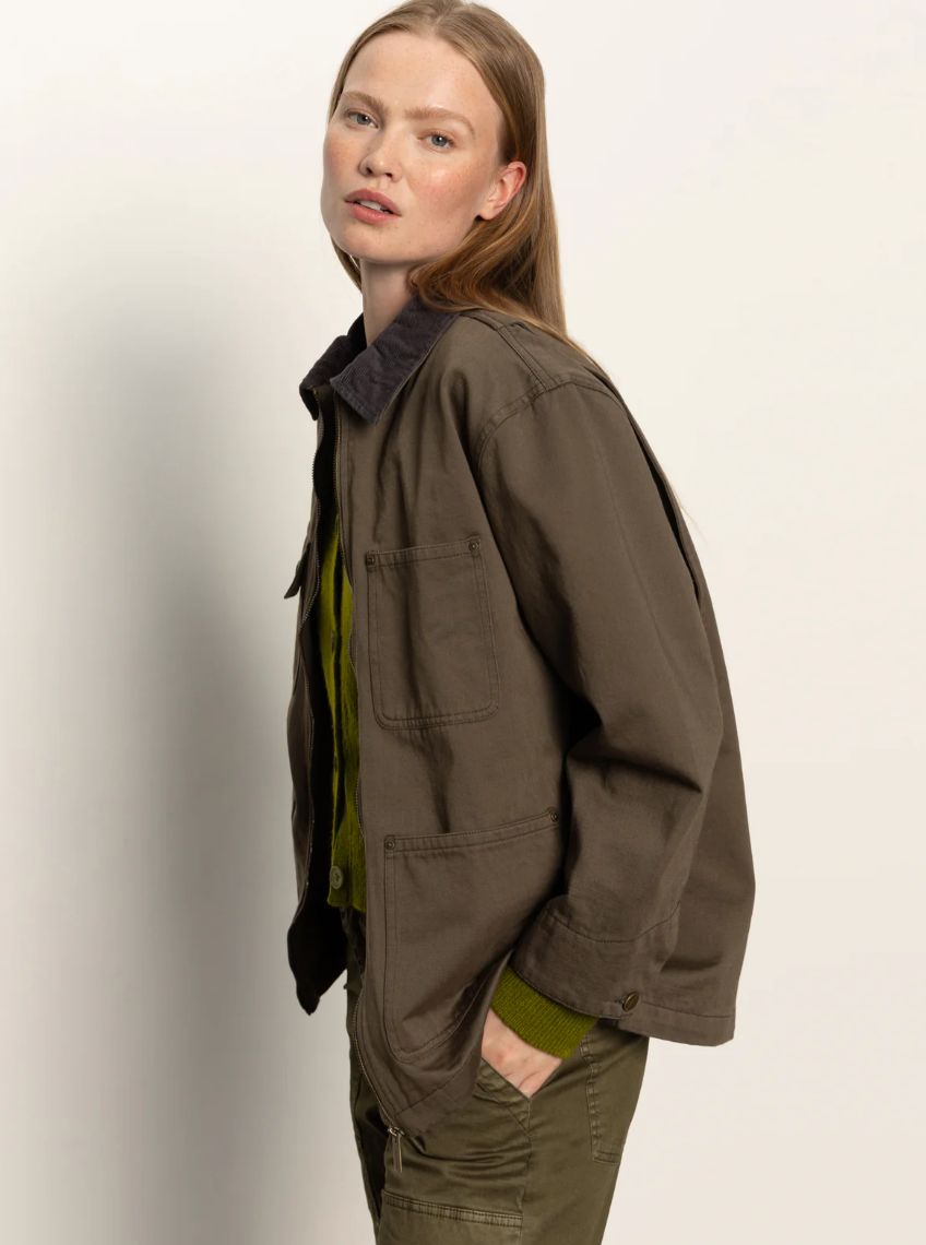The Barn Jacket in Burnt Olive features a contrasting corduroy spread collar, lightweight design, and a relaxed fit for everyday comfort. With a zipper front closure, 2 chest flap pockets, and 2 front patch pockets, it's a functional and stylish outerwear choice.