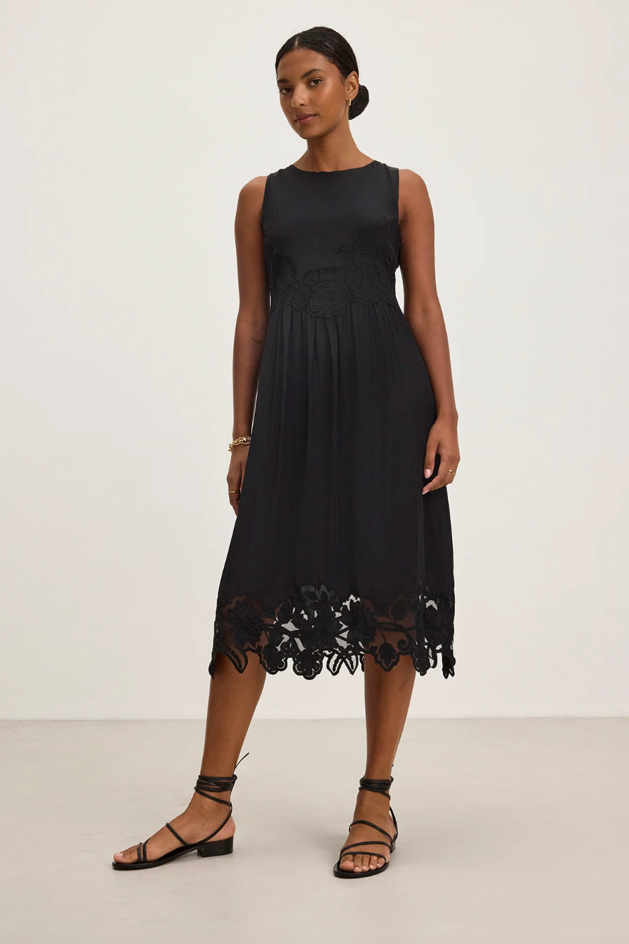 The Bianca dress from Velvet by Graham & Spencer features a sleek silhouette with delicate details. Crafted from viscose with a subtle sheen, this midi dress features a round neckline, sleeveless design, and intricate lace accents at the waist and hem. A side zipper ensures a seamless fit, while the lining provides added coverage.