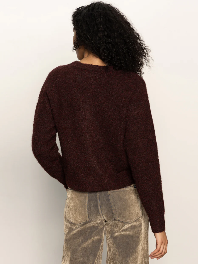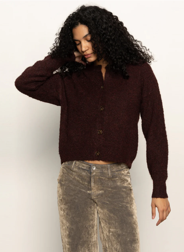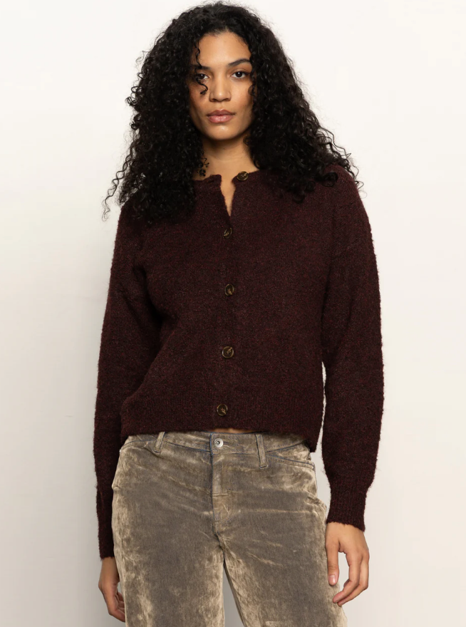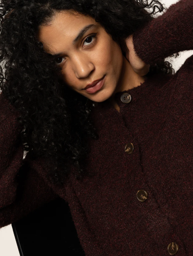 The Boucle Cardi in Dark Crimson features a cozy boucle fabric, a classic button front, and ribbed hem and cuffs for a timeless look. Its deep red color adds a bold touch to any outfit, perfect for layering in cooler weather.