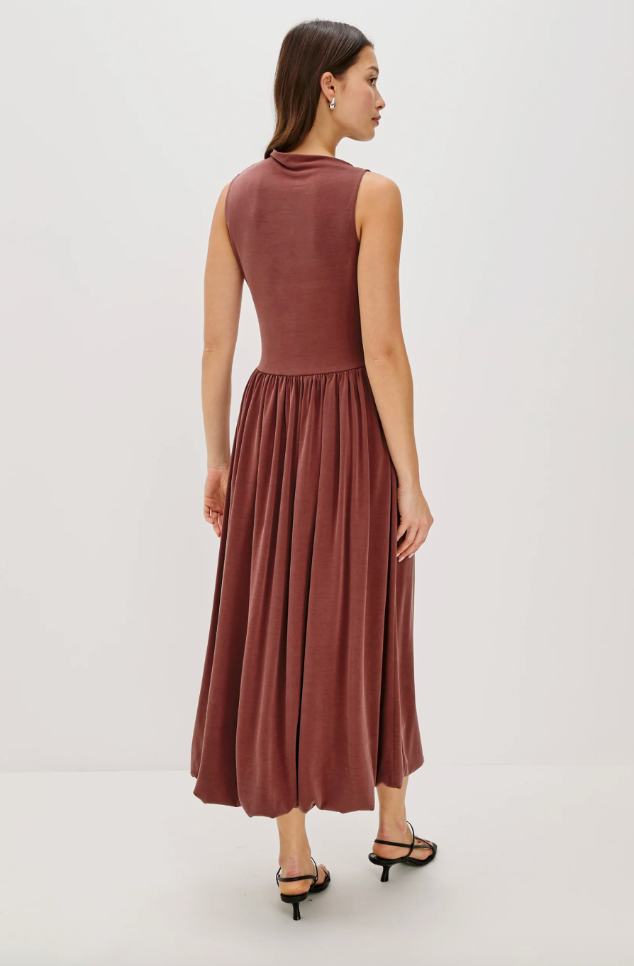 Made from soft jersey, the Brina is a midi-length dress with shirred details for a form-flattering fit. A fitted cowl-neck bodice gives way to an A-line skirt with a bubble hem.