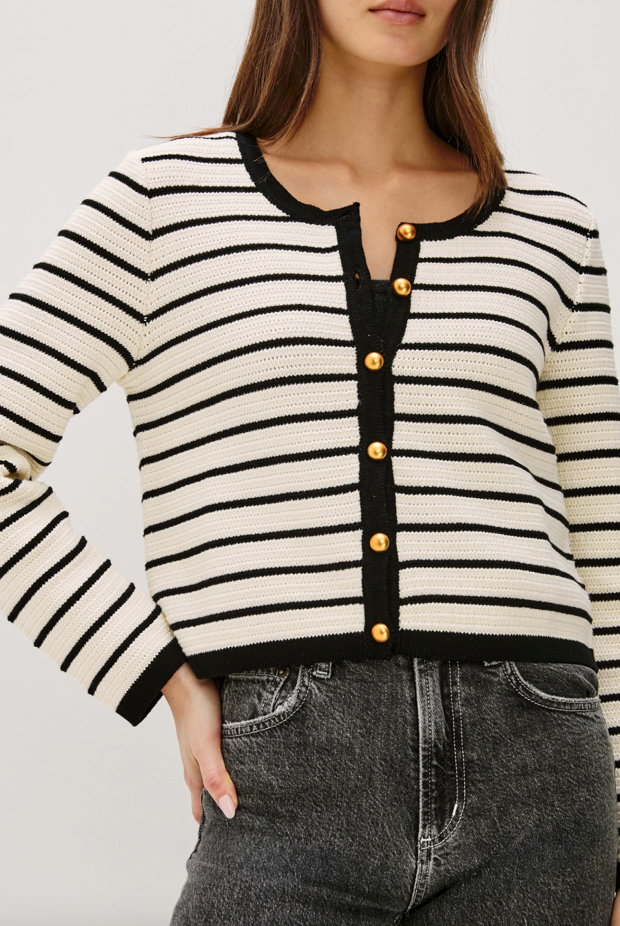 The Catania is a cotton cardigan with a boxy, cropped fit. It showcases contrast details at the sleeves and neckline, along with distinctive hardware buttons.