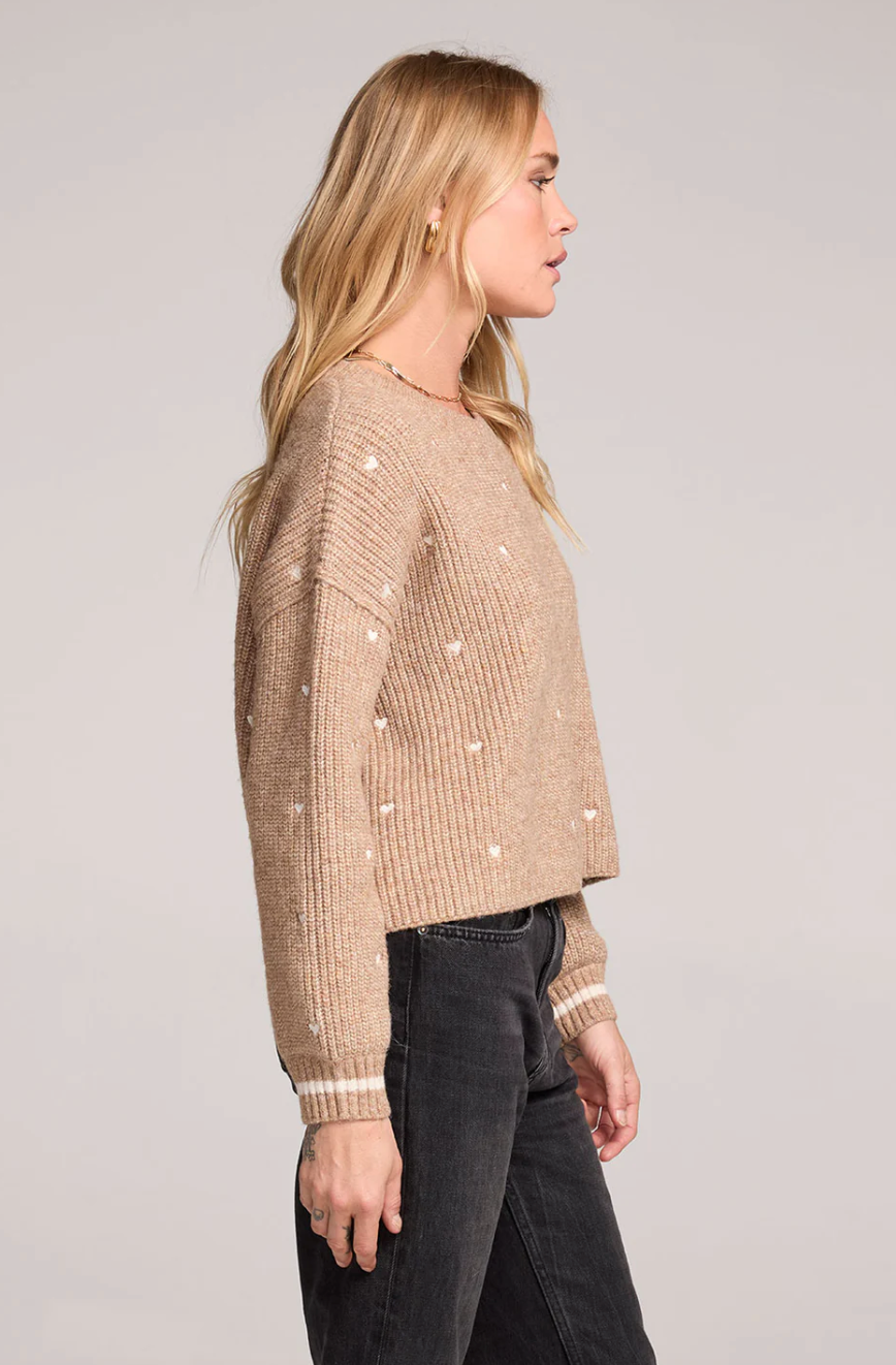 The Charmer Sweater combines sweet charm with stylish sophistication, featuring a petite heart motif and twin white bands around each wrist.