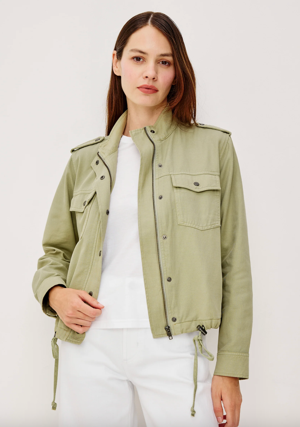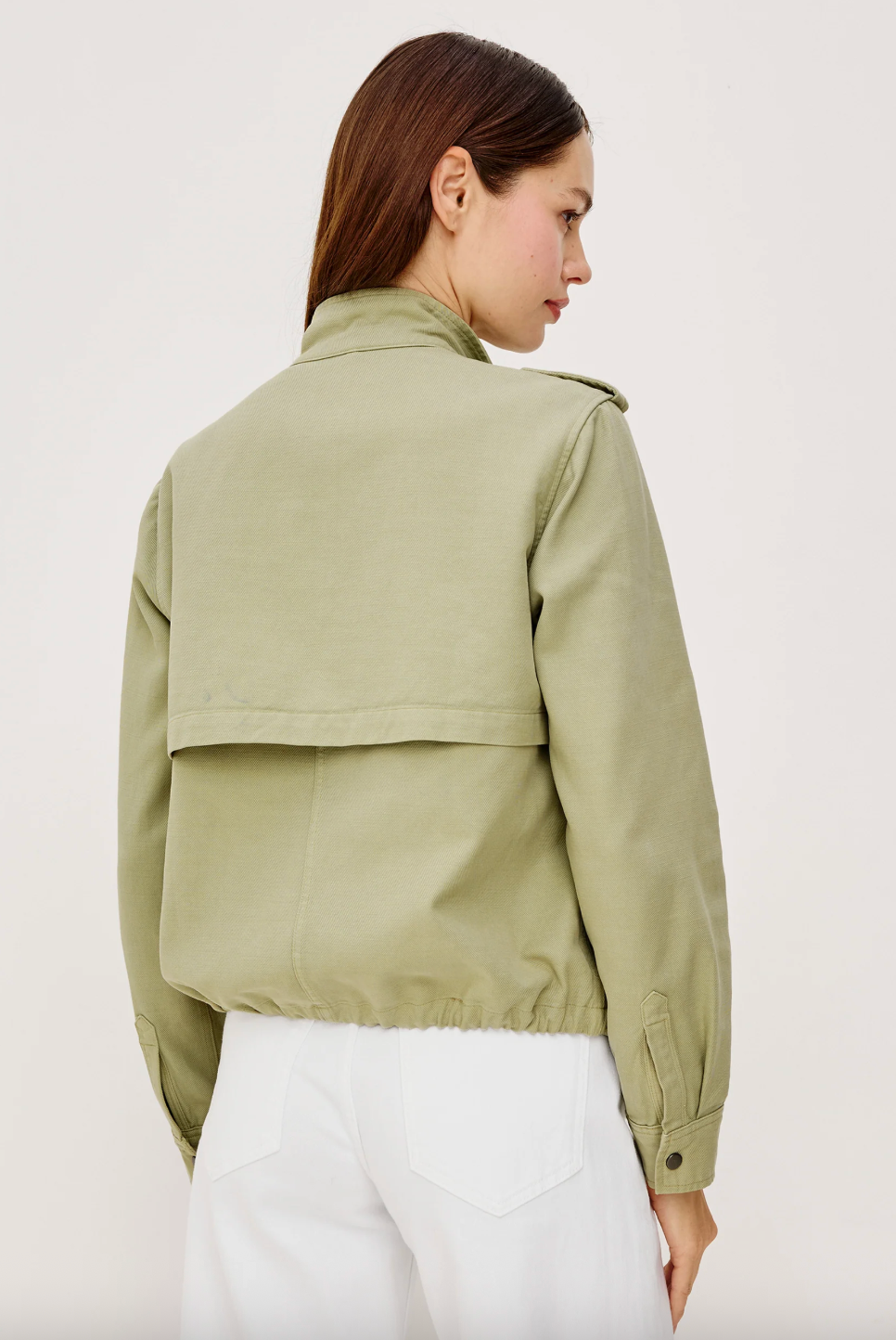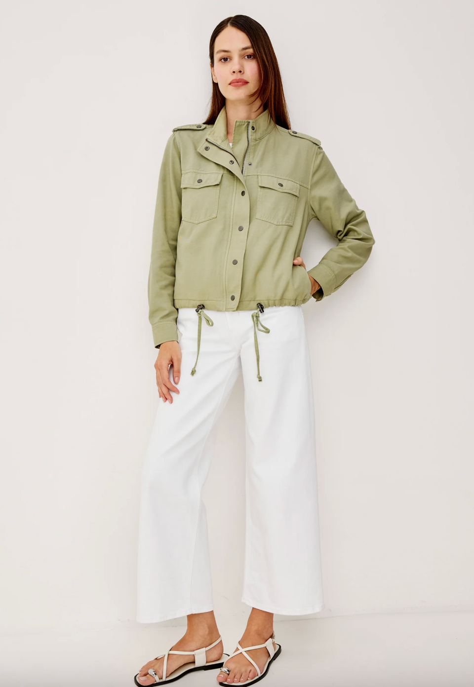 The Collins is a military-inspired jacket in ultra-soft cotton lyocell denim, featuring a stand collar, shoulder epaulettes, flap chest pockets, front snap buttons, and a cropped drawstring hem.