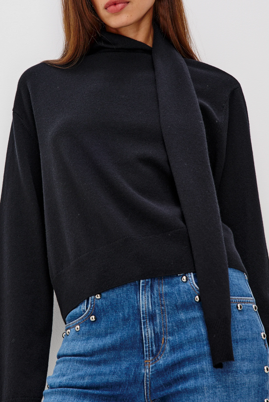 Understated yet impactful, the Cortina is a wool-cashmere blend sweater designed for cozy sophistication, featuring a self-tie attached scarf and long sleeves for versatile, elevated layering.