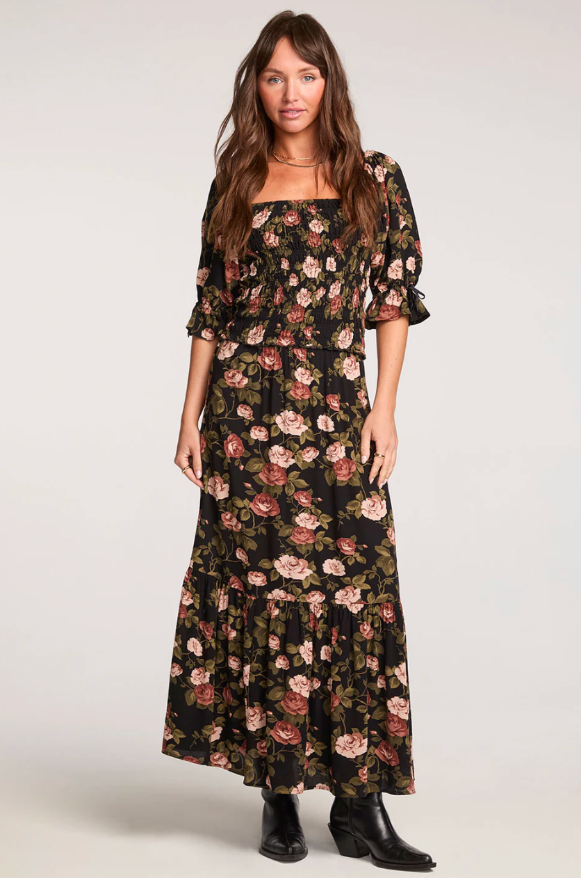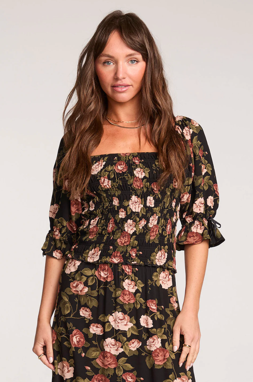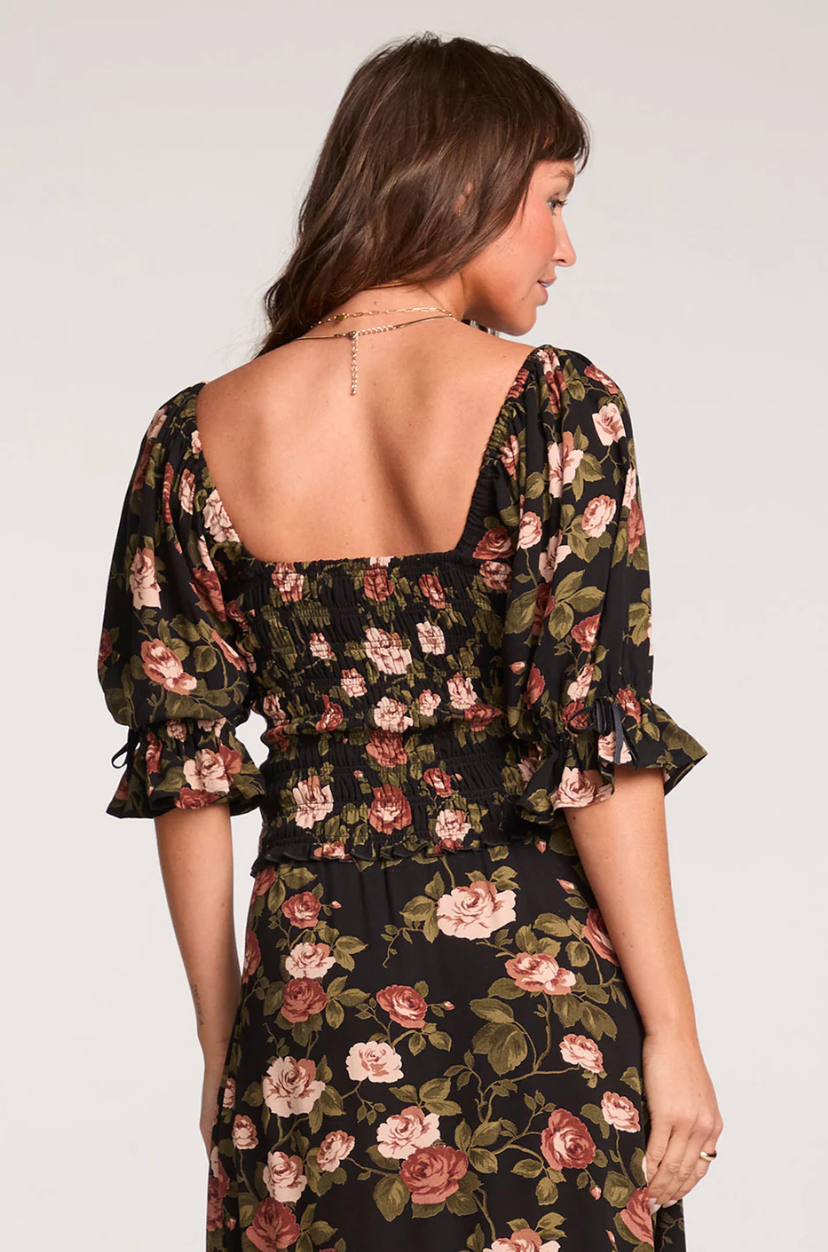 The Eddith Top features a romantic dark floral print that adds subtle depth and elegance.