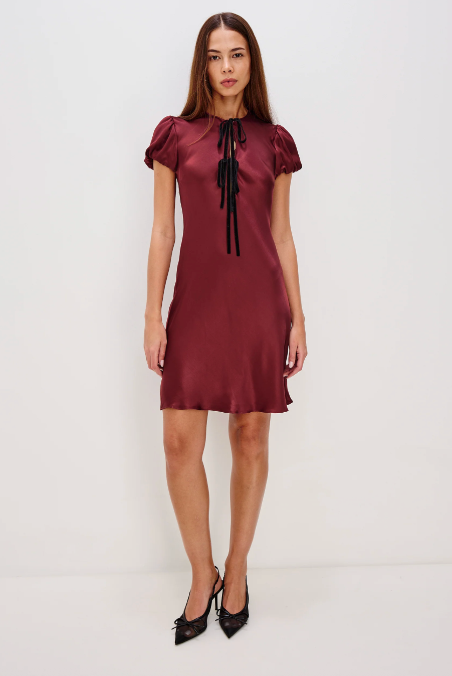 A midi dress made to flatter, the Elysia charms with short puff sleeves and a deep V-neckline adorned with velvet bow self-ties. Cut on the bias from luxurious satin-back crepe, it slips on effortlessly, ready for any occasion.