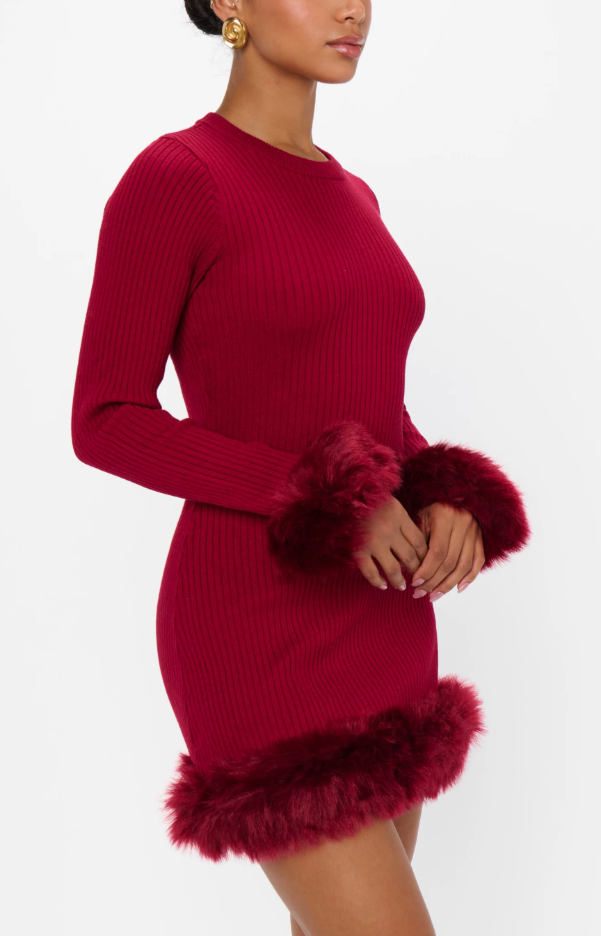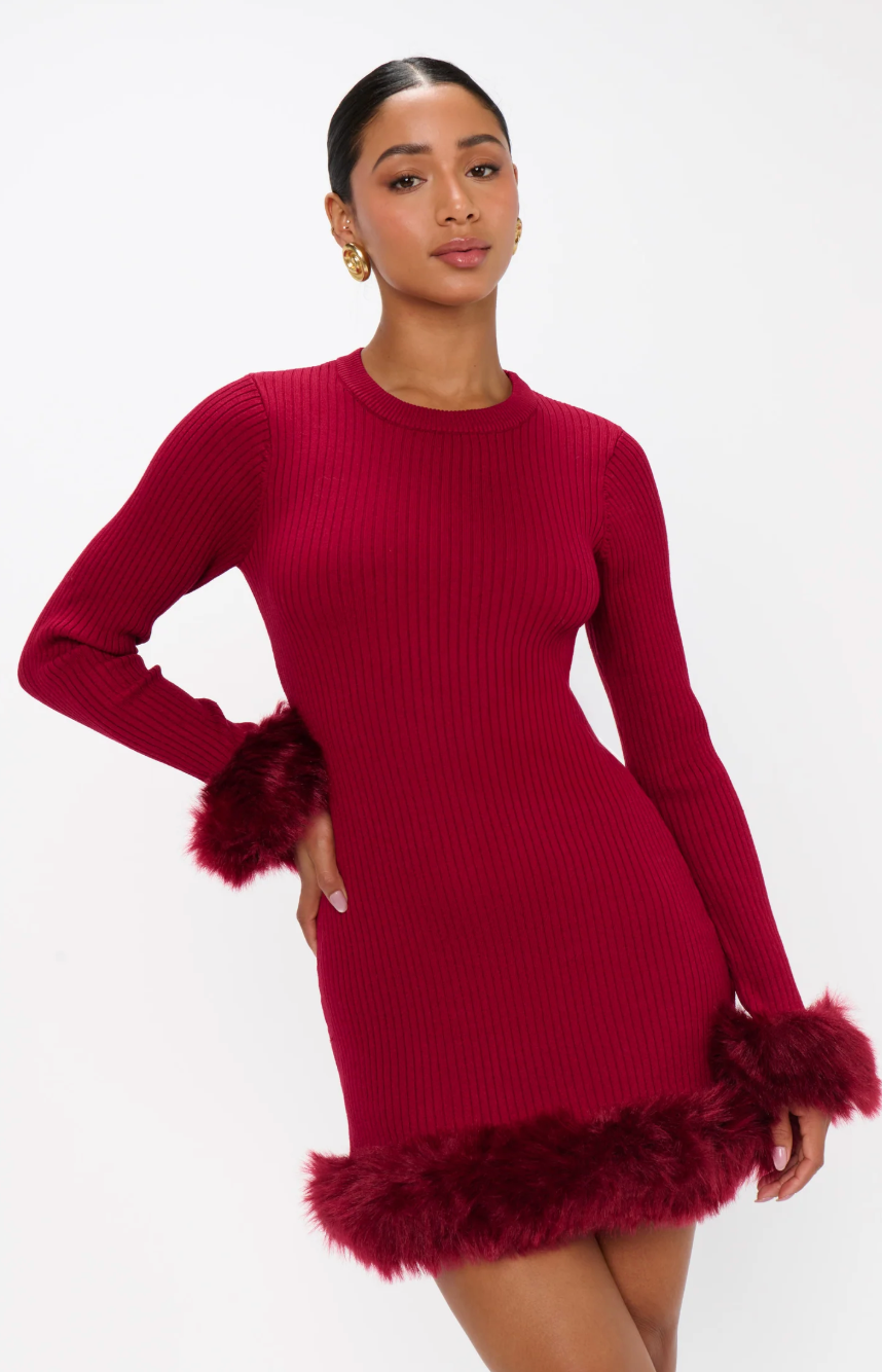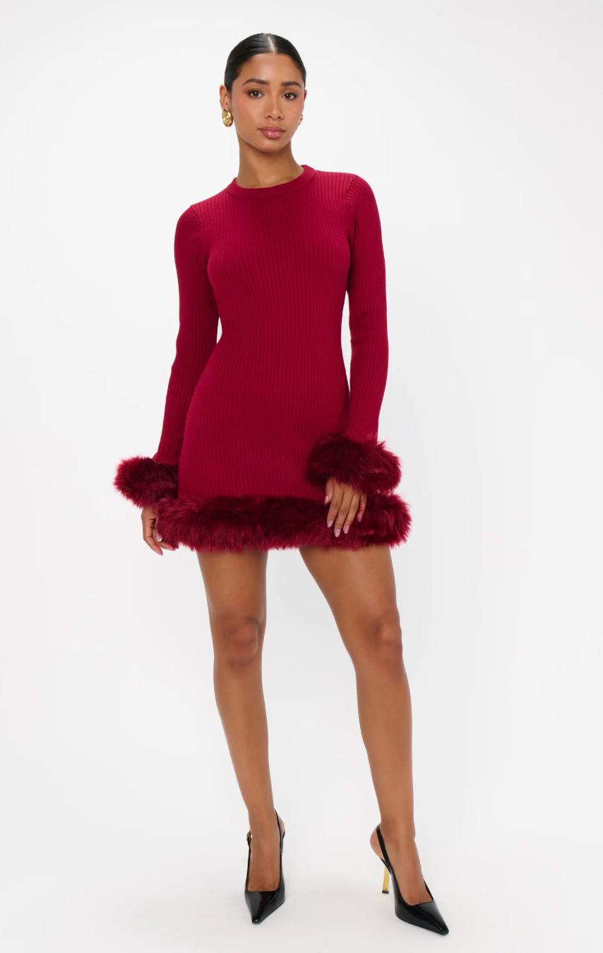 Worth making plans for! The Fran Mini is a super cute bodycon with a faux fur hem and cuffs. Dress her up with platforms and a rhinestone bag for a flirty evening look.