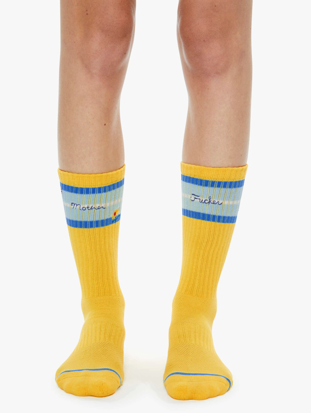 Watch your step. Extra-tall tube socks with an explicit message from MOTHER. Shown here in yellow with blue stripes and text across the top.