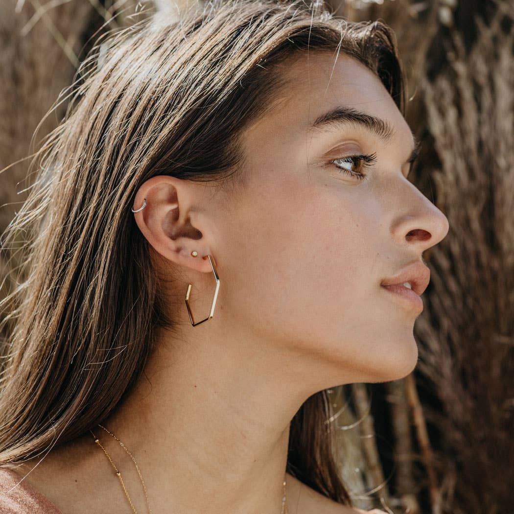 We scored these dead stock vintage earrings and polished and plated them. These hexagons measure 1.5" and have surgical steel posts.