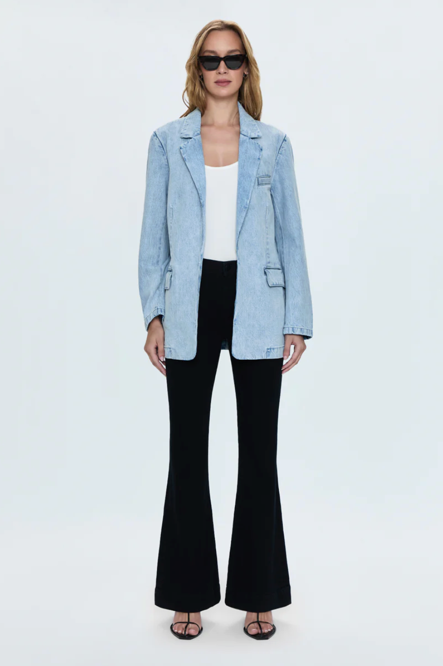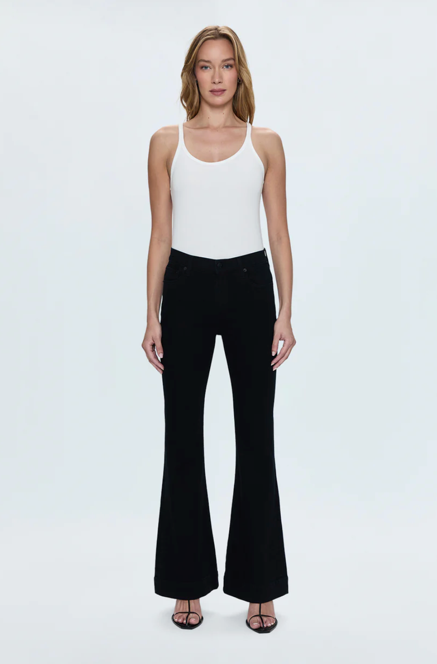 The flare that brings the drama. Kinsley sits at a comfortable mid rise with an ultra flare silhouette and full-length 32 1/2" inseam that creates maximum movement and vintage-inspired proportions. The dramatic flare from knee to hem delivers retro sophistication with modern comfort. Crafted from stretch denim in Black Ink, a saturated black wash for sleek, all-season styling.