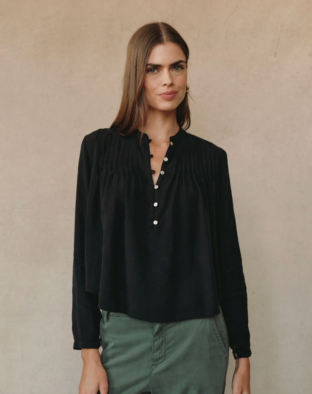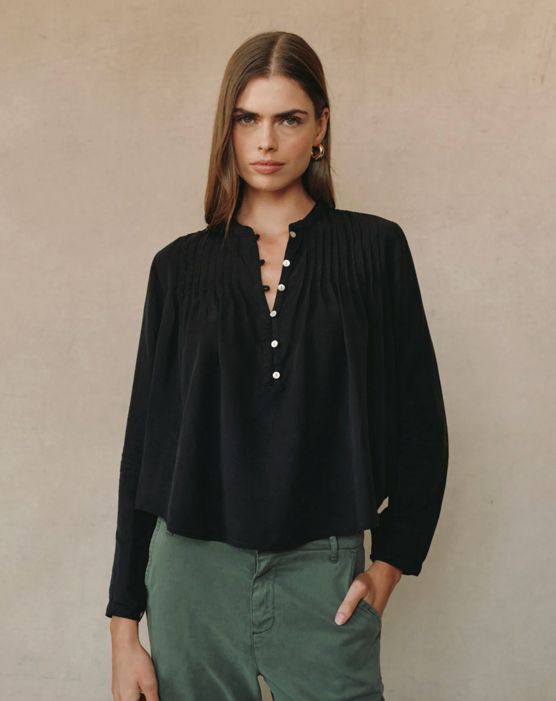 - Pintuck shoulder detail - adds subtle structure and feminine interest.