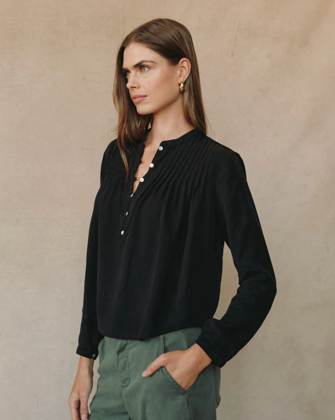 The Long Sleeve Pintuck Pullover is a versatile staple designed for everyday wear.