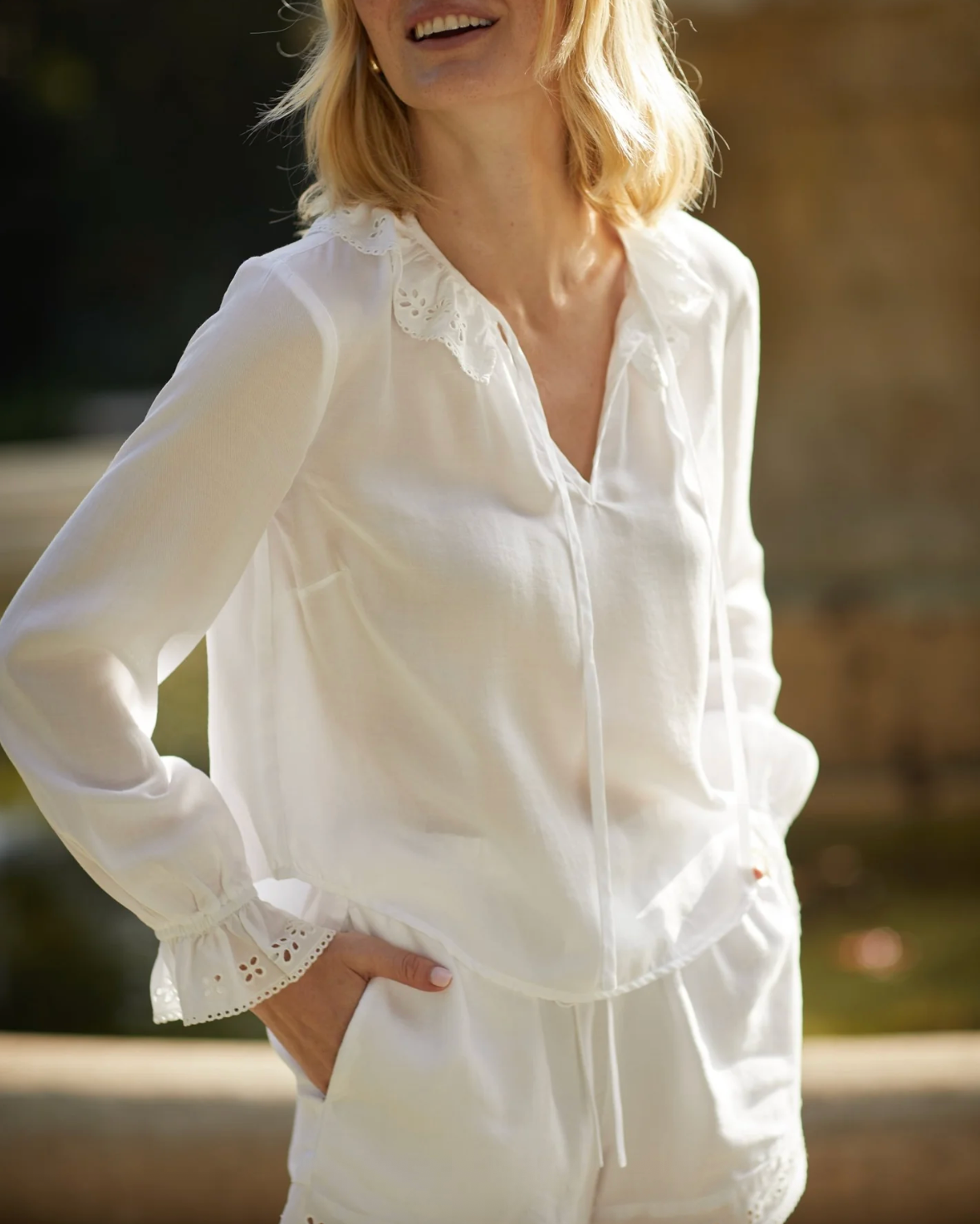 The Long Sleeve Tie Neck Ruffle Top is a romantic, airy blouse designed with soft structure and elevated, romantic details, featuring a tie-neck detail that's adjustable and polished with a refined, feminine touch, a ruffle collar and sleeves that create gentle movement and a soft, romantic silhouette, a relaxed fit with an easy, comfortable drape for effortless wear, and a delicate embroidered hem sourced from a Paris flea market for unique, artisanal charm.