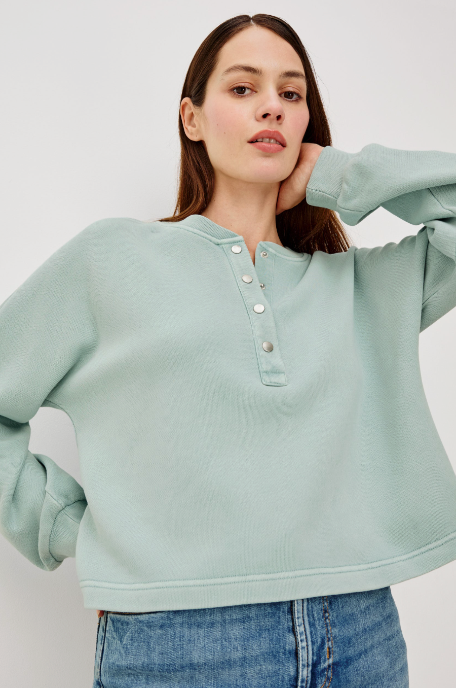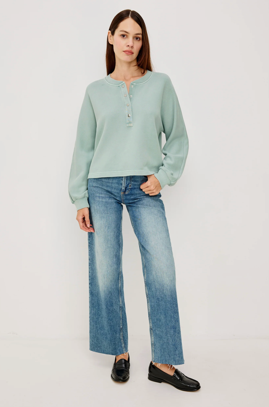 The Leonie is a relaxed, boxy-fit top in breathable French terry. It features a metallic half-placket, puff long sleeves, and ribbed neckline and cuffs.