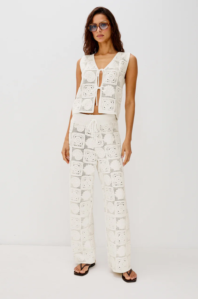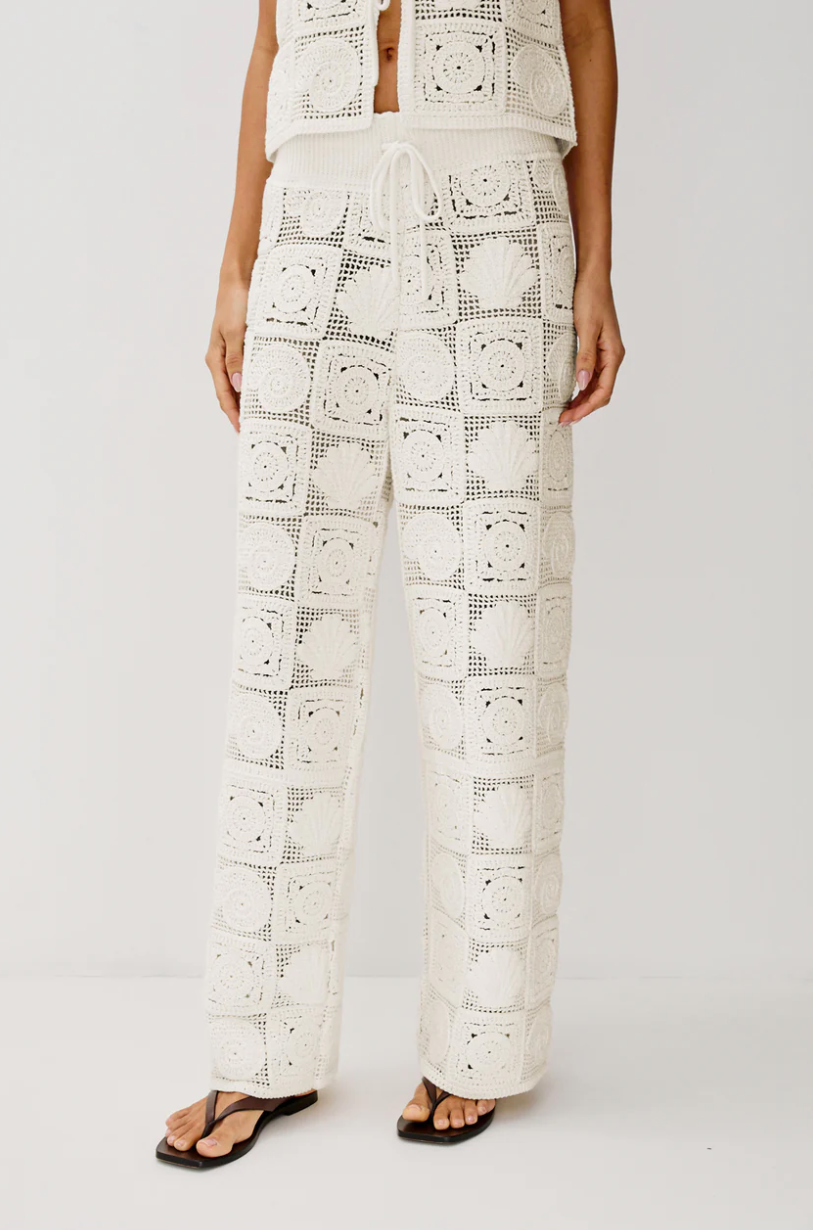 The Maja pant is a classic wide-leg, high-waisted style with a shirred drawstring waist. It features a unique open-stitch shell motif crochet design and a short lining for comfort. Pair with the Paz top for the ultimate set. Part of the Rails X Lspace collab
