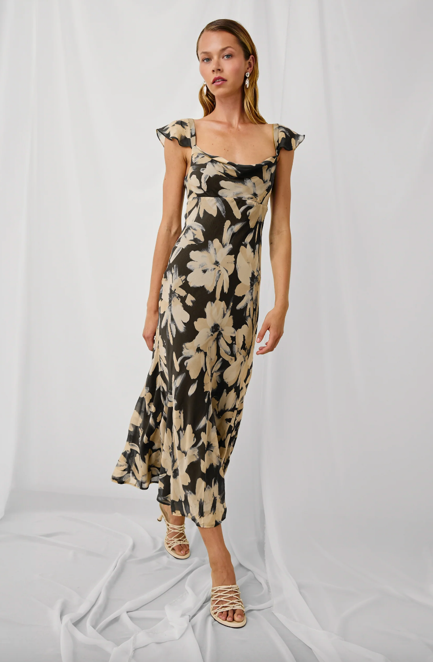 The Marigold is a chiffon midi dress with a subtle cowl neck and statement flutter sleeves. It has a more fitted bodice that flows into a flared midi skirt that moves with you.