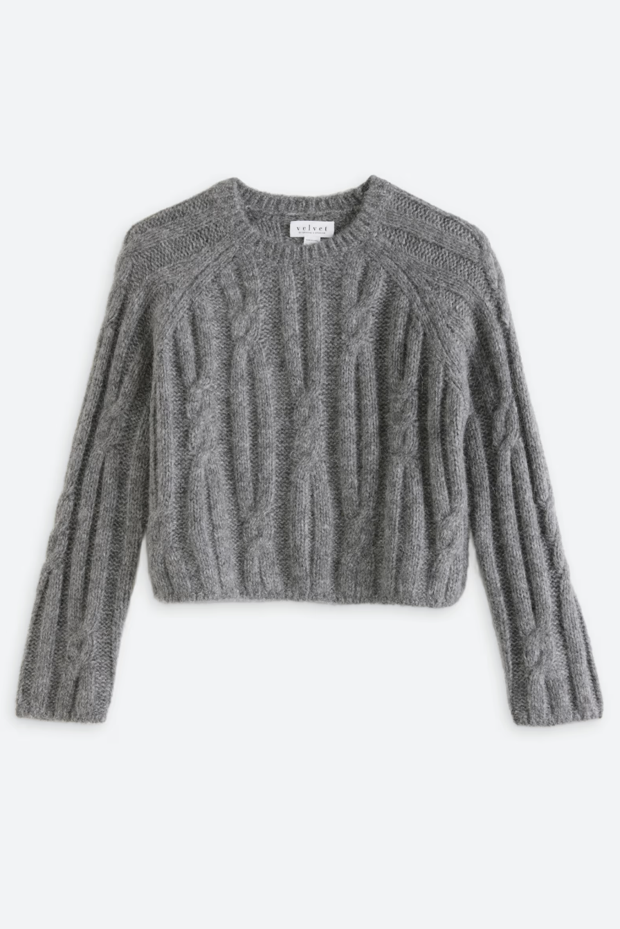 Combining a timeless cable knit with metallic threading for a subtle shimmer, this sweater brings a modern twist to a classic design. Cropped and slightly chunky with a crew neckline, it's a versatile layering piece that adds warmth and texture to any look.