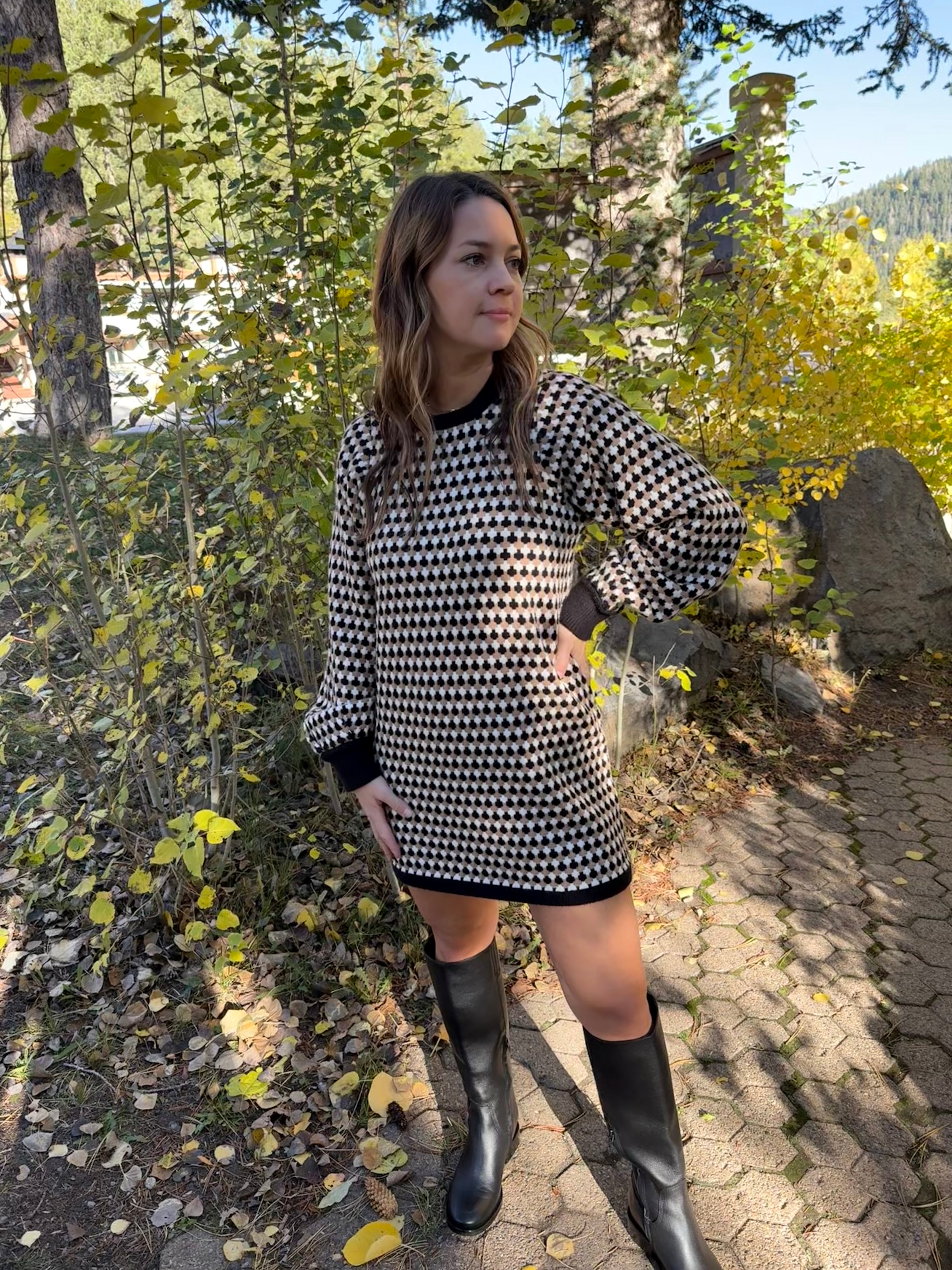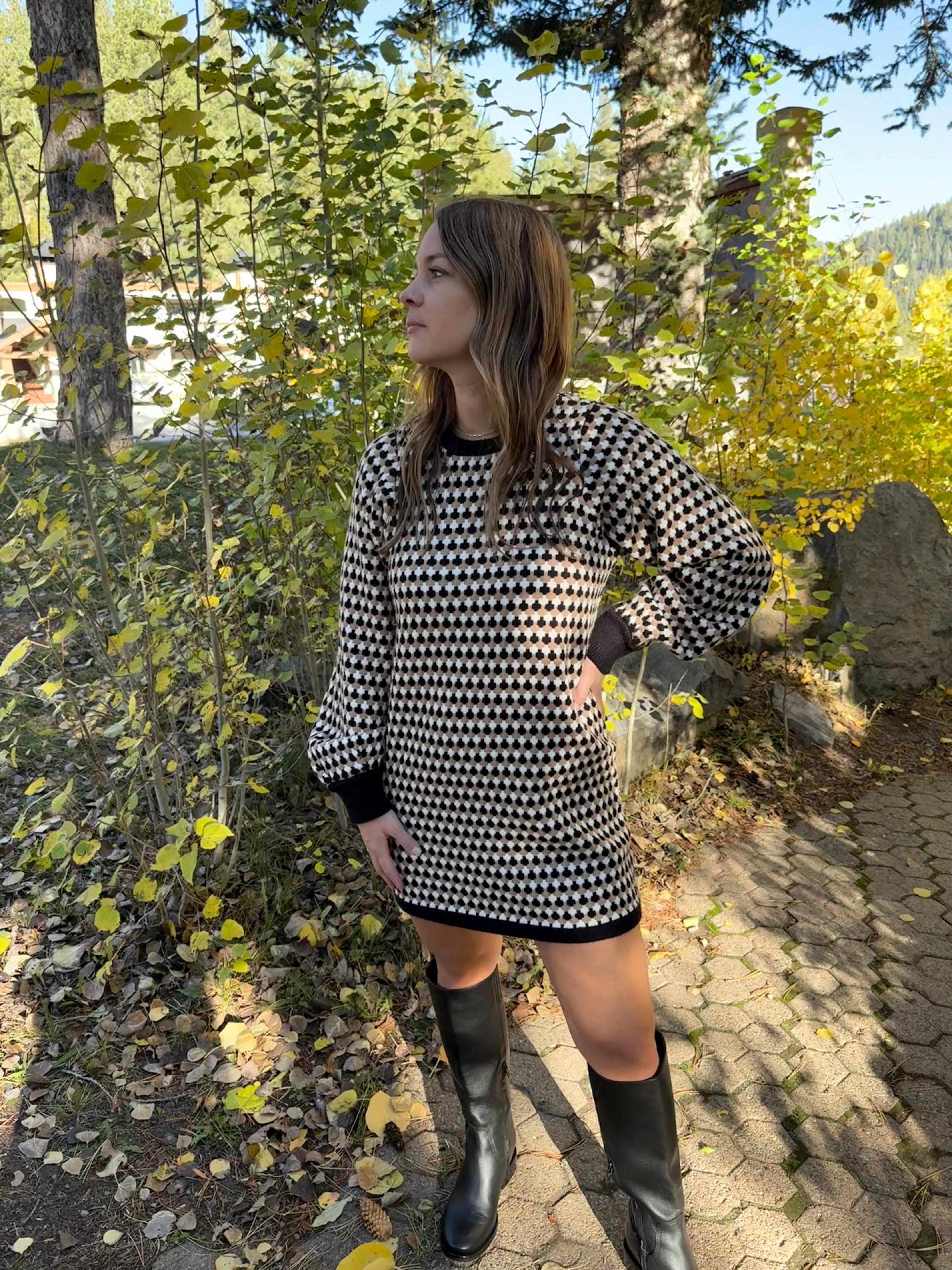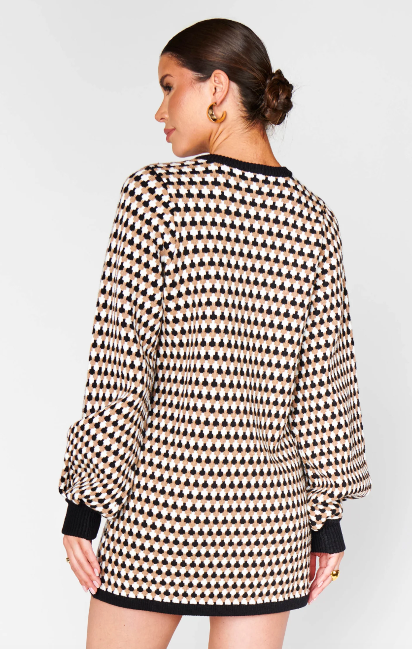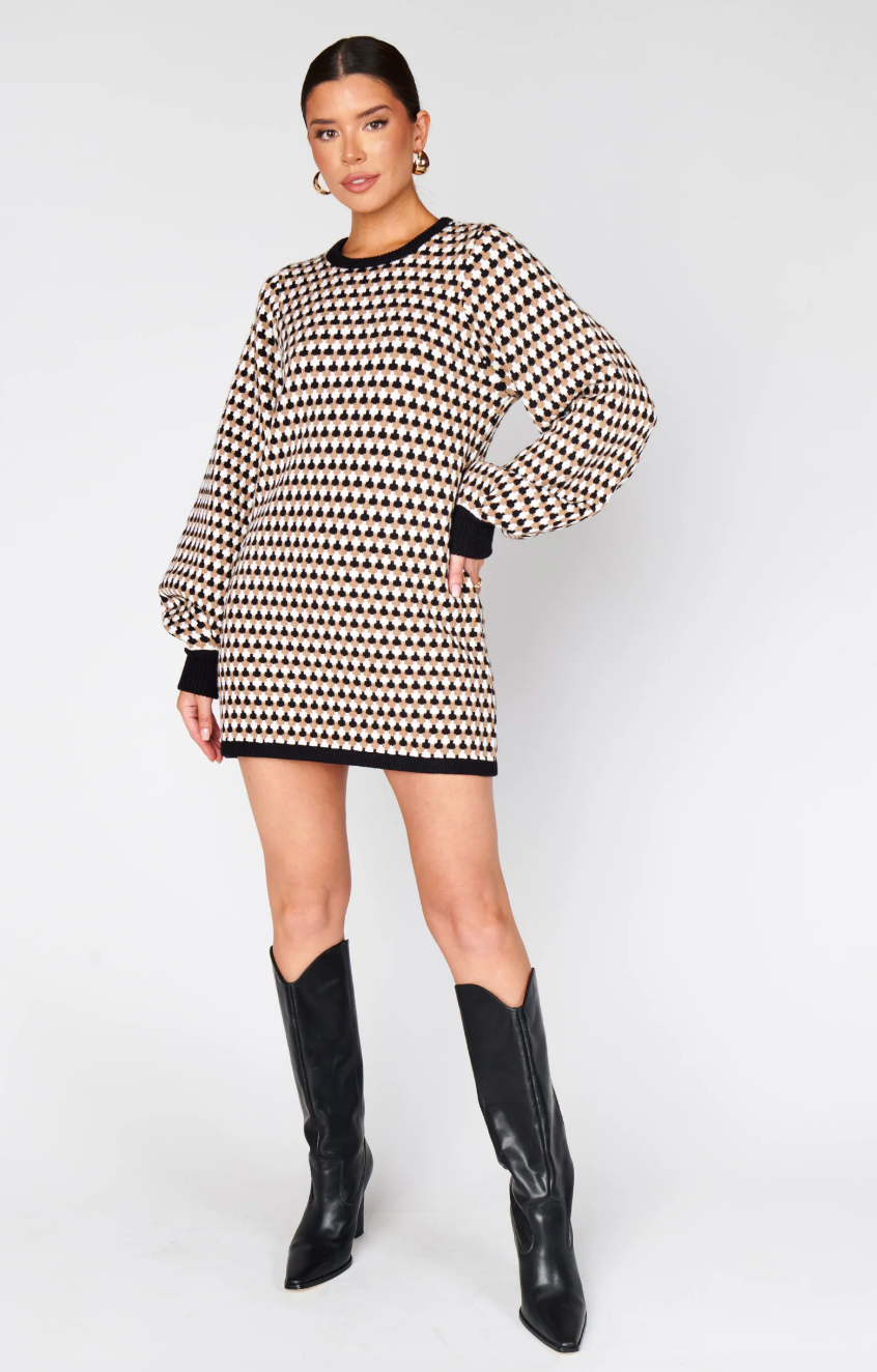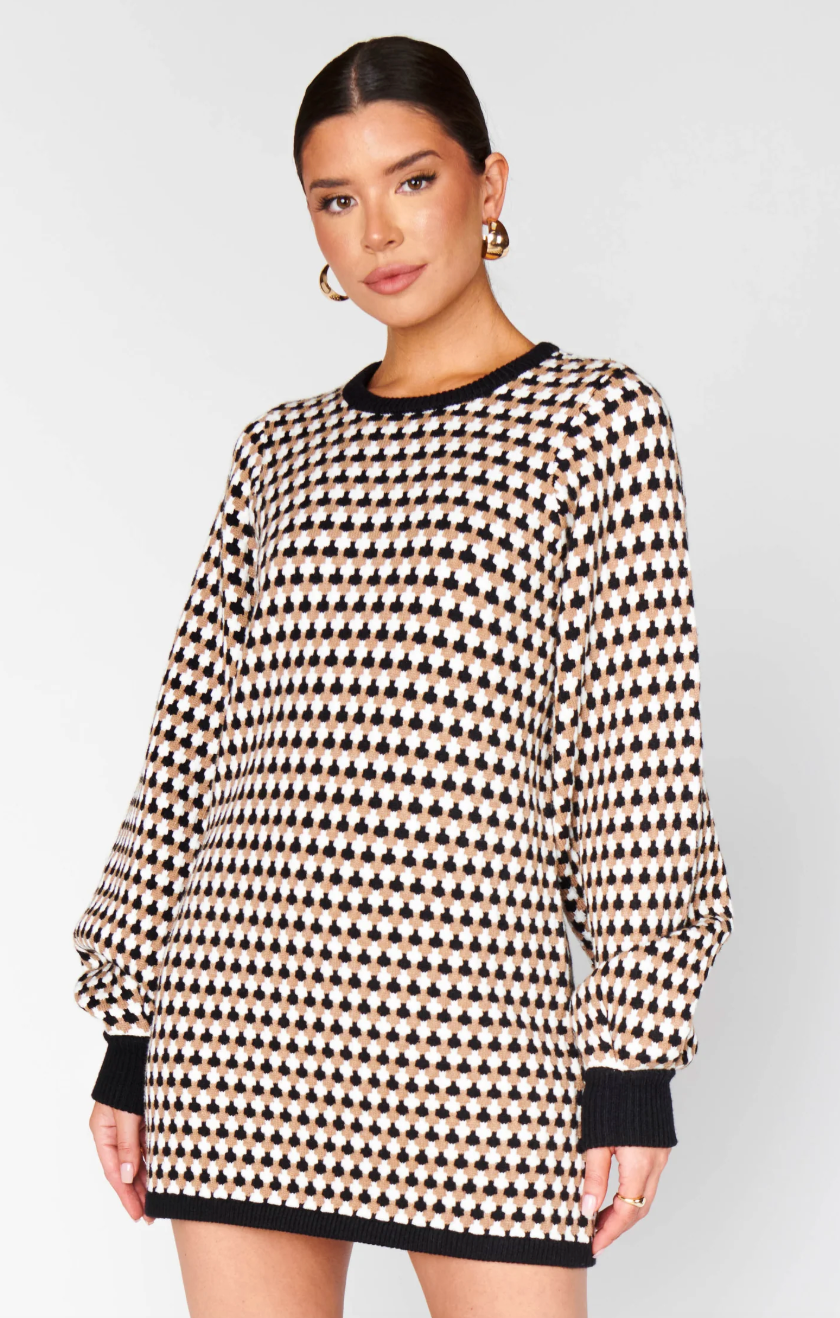 The Marion Sweater Dress is cozy cool with a twist! Its relaxed fit and dropped shoulders wrap you in comfort, while the retro geo print adds a playful pop that takes it from comfy to standout. Perfect for weekend brunch or casual nights out.