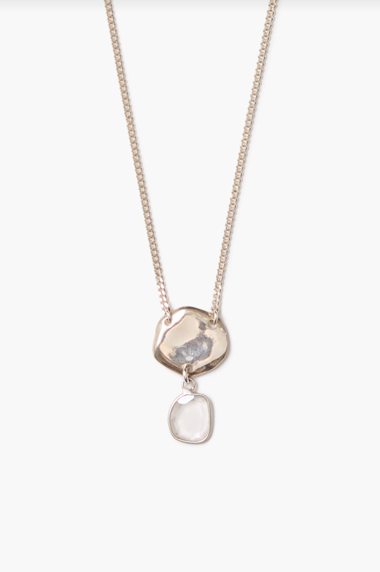 The Mirage Coin Necklace features a hammered silver coin and sliced moissanite pendant on a delicate chain. Fastens with a lobster clasp and extender chain.