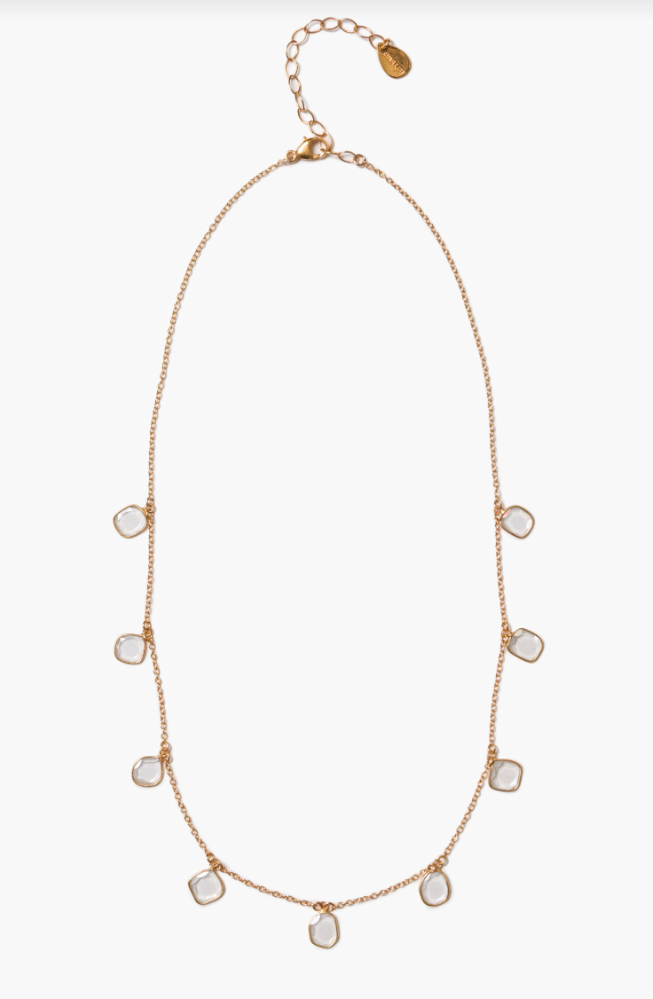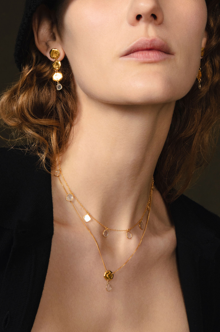 A shimmering necklace made of delicate slices of moissanite, wrapped in gold and fixed along a thin gold chain necklace.