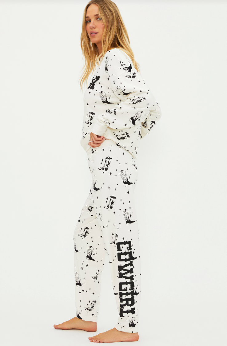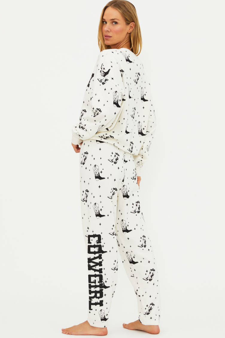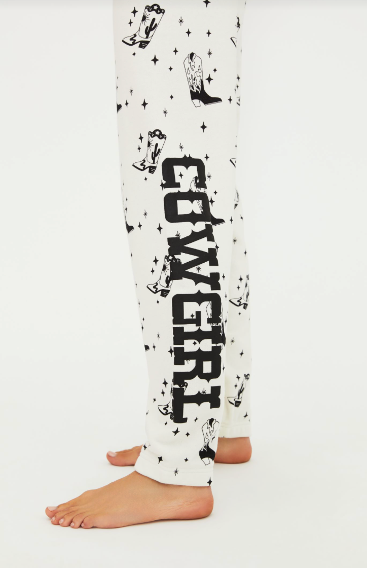 Slip into effortless comfort with these Nash Howdy Pants, featuring a buttery-soft fabric. Adorned with charming cowboy boots throughout and "Cowboy" printed down the leg, they bring a touch of whimsy to your everyday style.