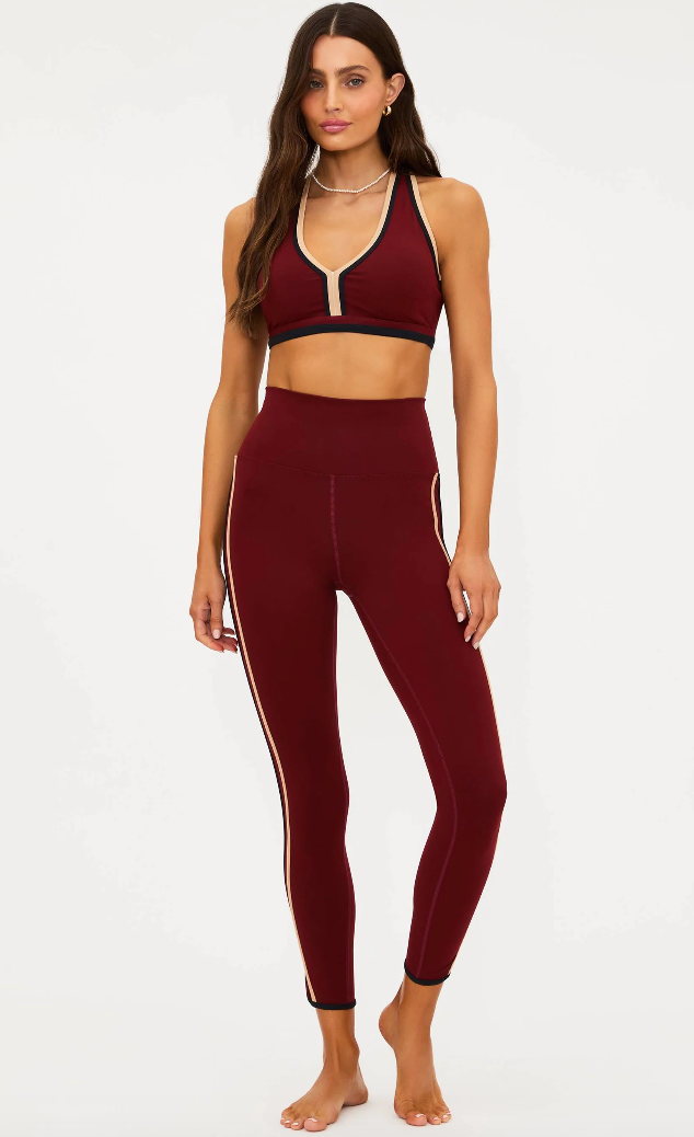 The Nella Legging in Maroon Colorblock features a 7/8 length design with a double-brushed finish for superior softness. Equipped with moisture-wicking fabric and 4-way stretch, it's perfect for both workouts and everyday comfort.
