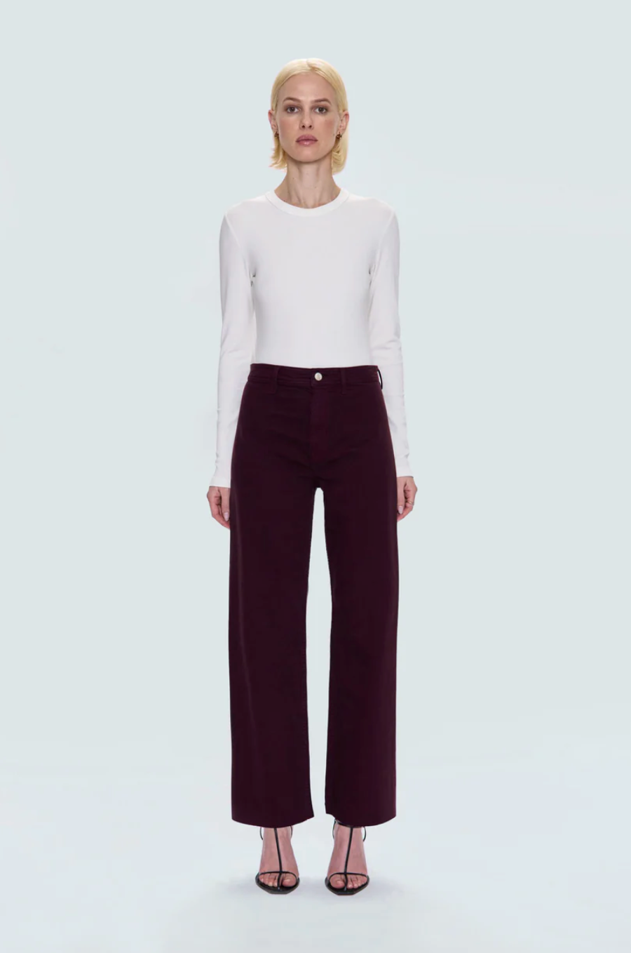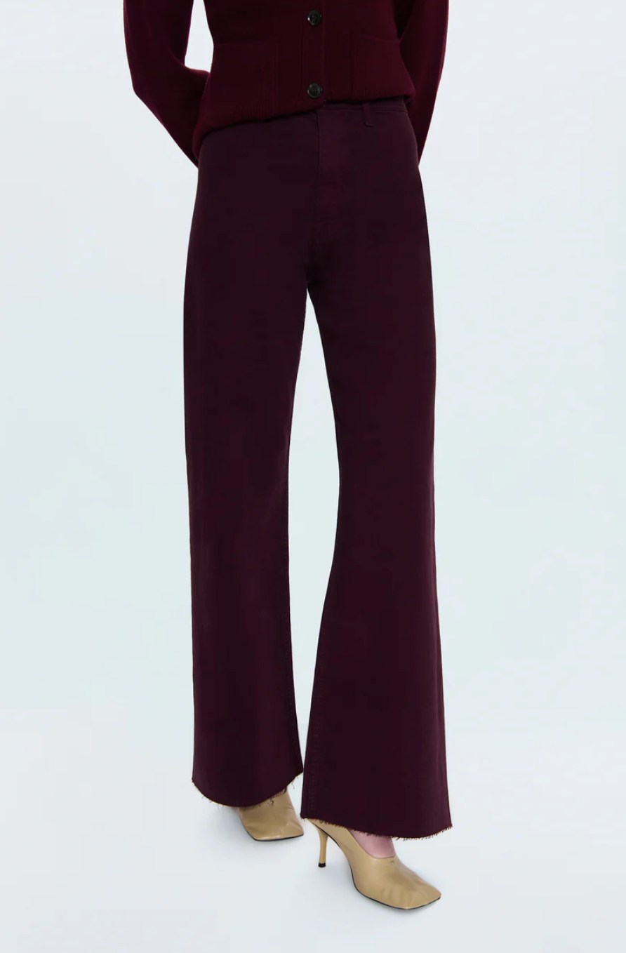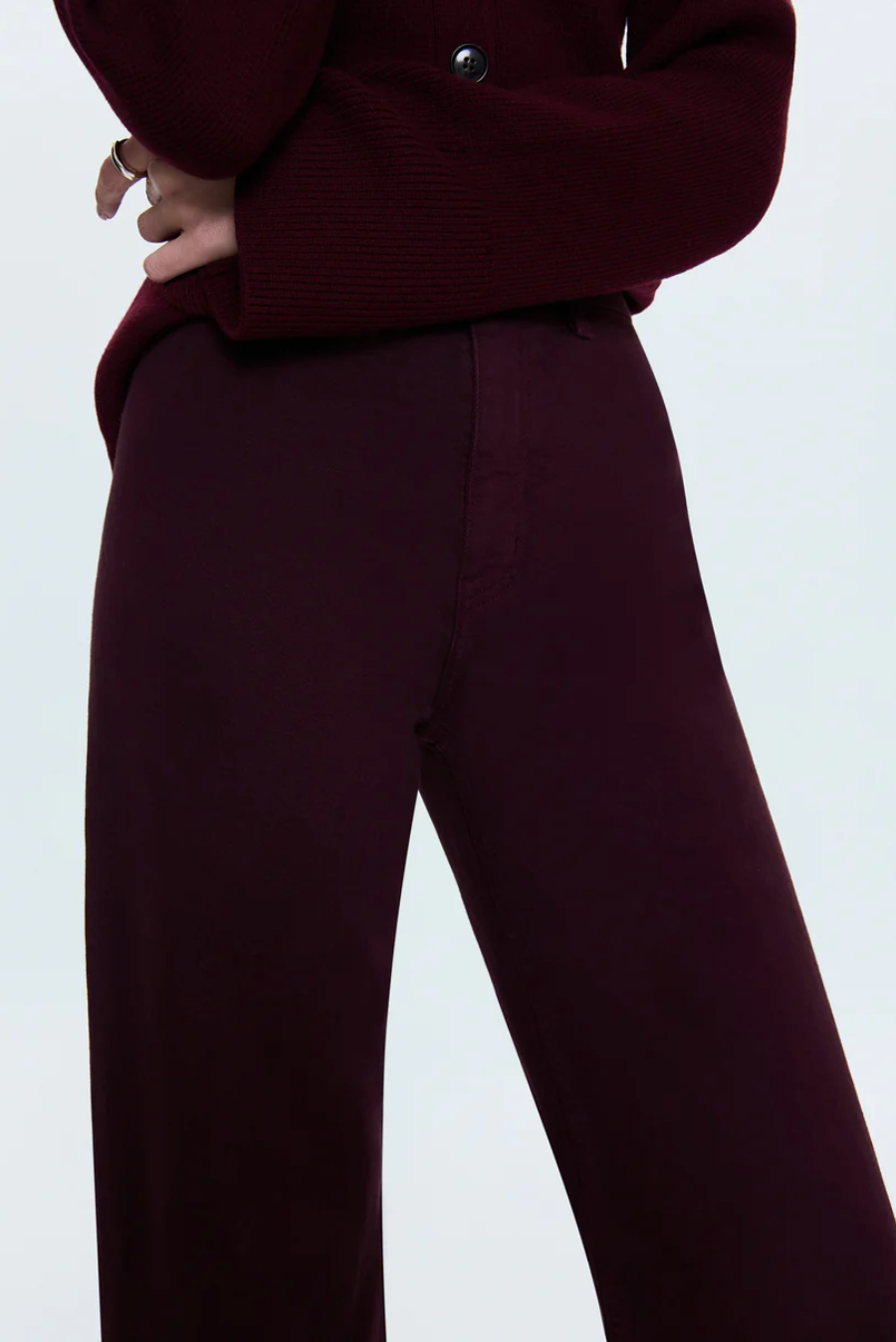 The wide leg that changes everything. Penny sits at a high rise with an ultra wide leg silhouette and full-length 32" inseam. Designed with no side seams for a clean, seamless silhouette that flows beautifully. The relaxed wide leg moves with intention while the high rise anchors the proportions perfectly. Utility-inspired details add functional appeal to the contemporary silhouette. Crafted from our comfort stretch denim in Claret, a rich wine color perfect for Fall.