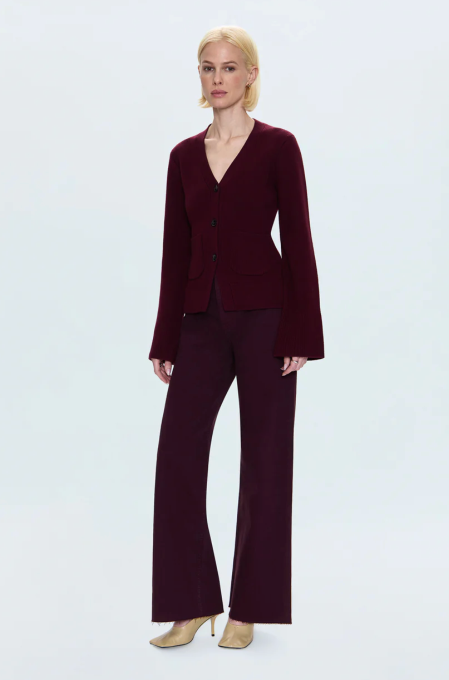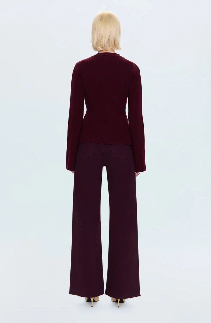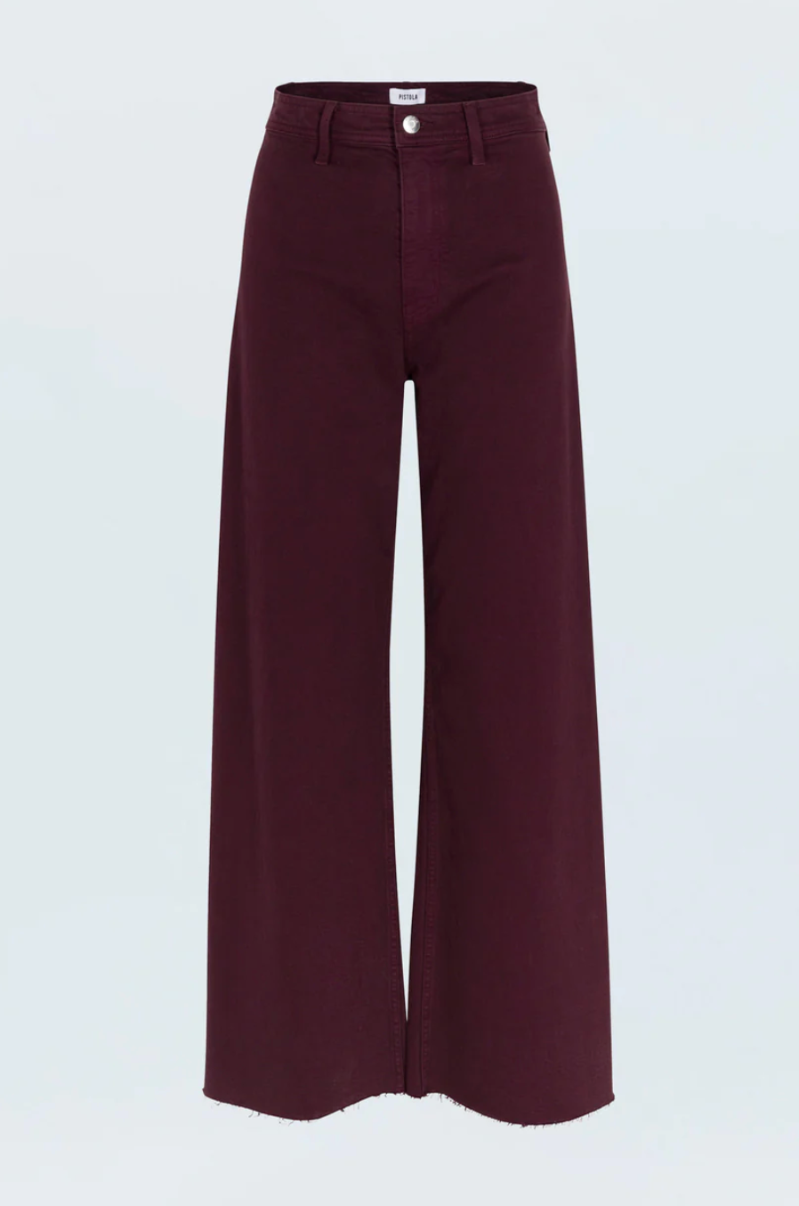 The wide leg that changes everything. Penny sits at a high rise with an ultra wide leg silhouette and full-length 32" inseam. Designed with no side seams for a clean, seamless silhouette that flows beautifully. The relaxed wide leg moves with intention while the high rise anchors the proportions perfectly. Utility-inspired details add functional appeal to the contemporary silhouette. Crafted from our comfort stretch denim in Claret, a rich wine color perfect for Fall.