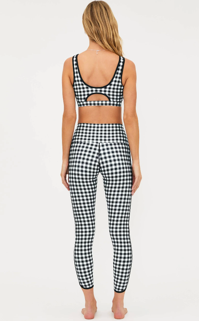 The Rella Legging in Slate Gingham features a high-rise waistband for a secure, flattering fit and moisture-wicking fabric to keep you cool and dry. Finished with contrast black piping, these leggings offer a sporty, elongated silhouette perfect for any activity.