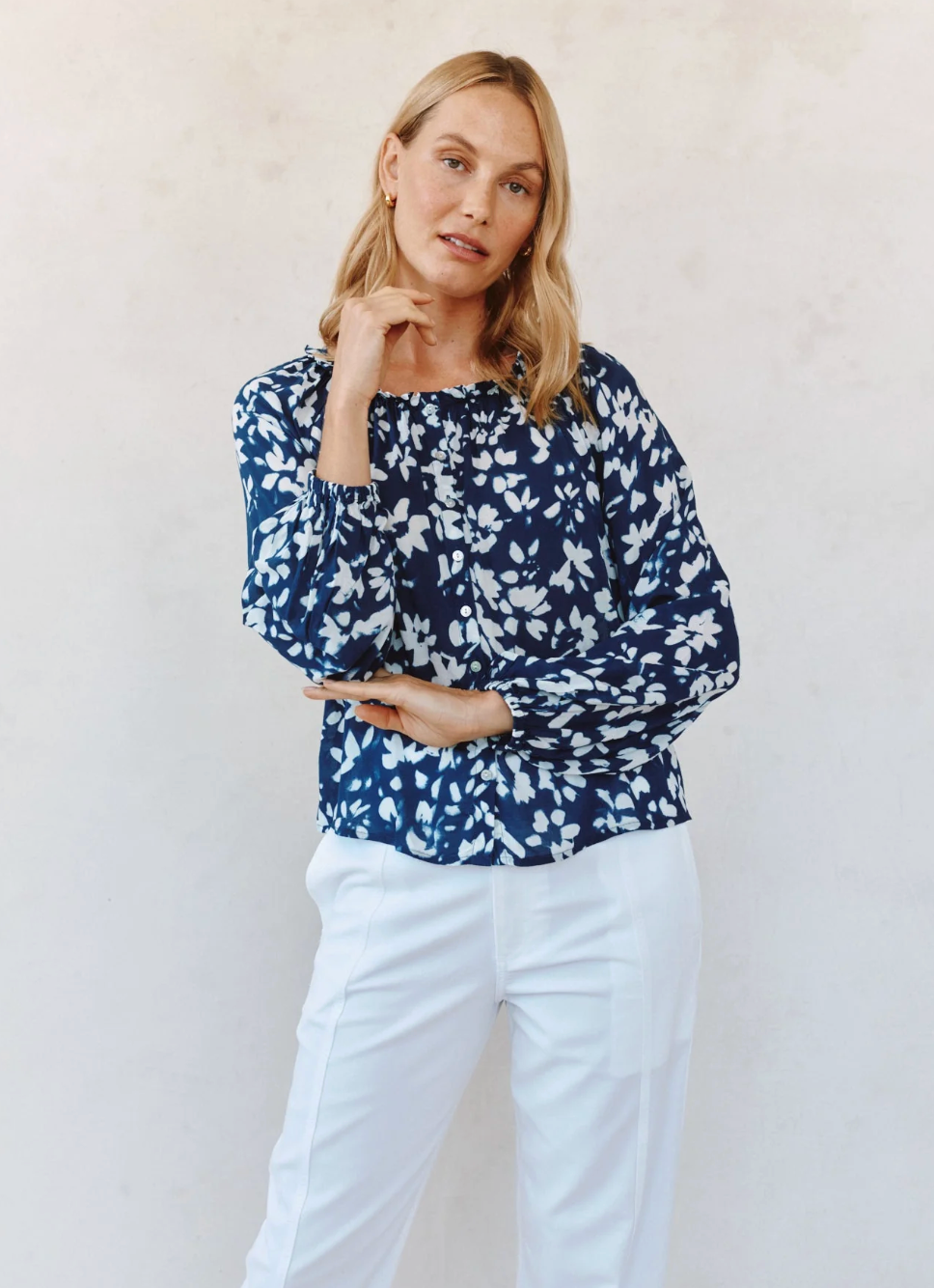 Ruffle Neck Raglan Button Down - Indigo Bloom Print