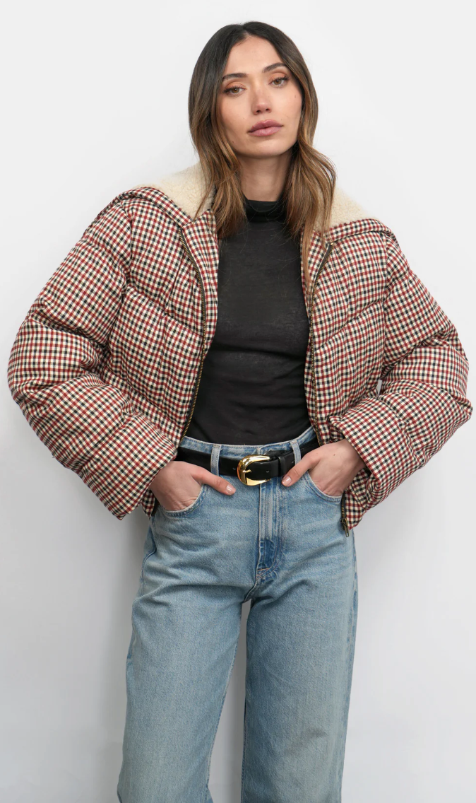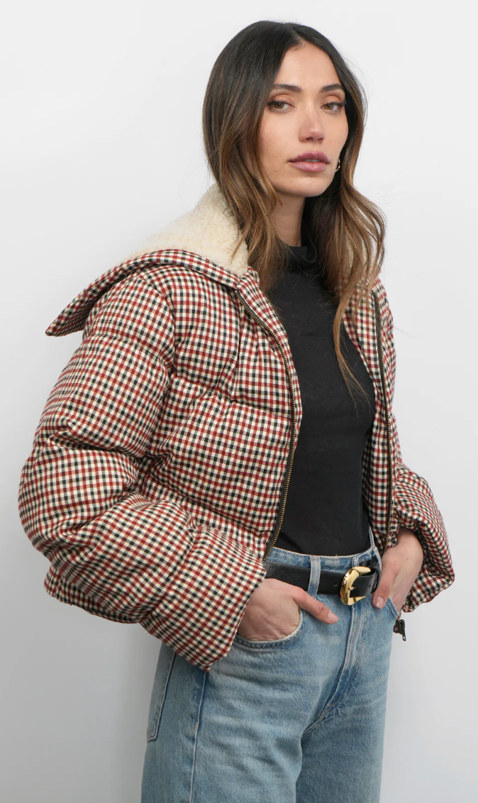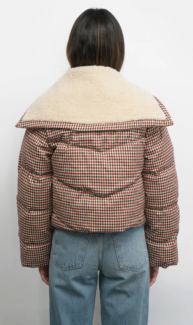 This stylish puffer jacket features a timeless gingham pattern in a classic color combination, offering a fresh take on cold-weather outerwear. It boasts a plush, soft shearling collar for added warmth and a luxurious touch, along with a secure zip-front closure.