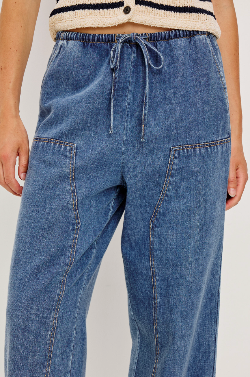 The Sanderson is a mid-rise, relaxed fit denim pant crafted from lightweight, supple cotton. Featuring carpenter panels for a laid-back look and an adjustable corded drawstring for a customized fit.
