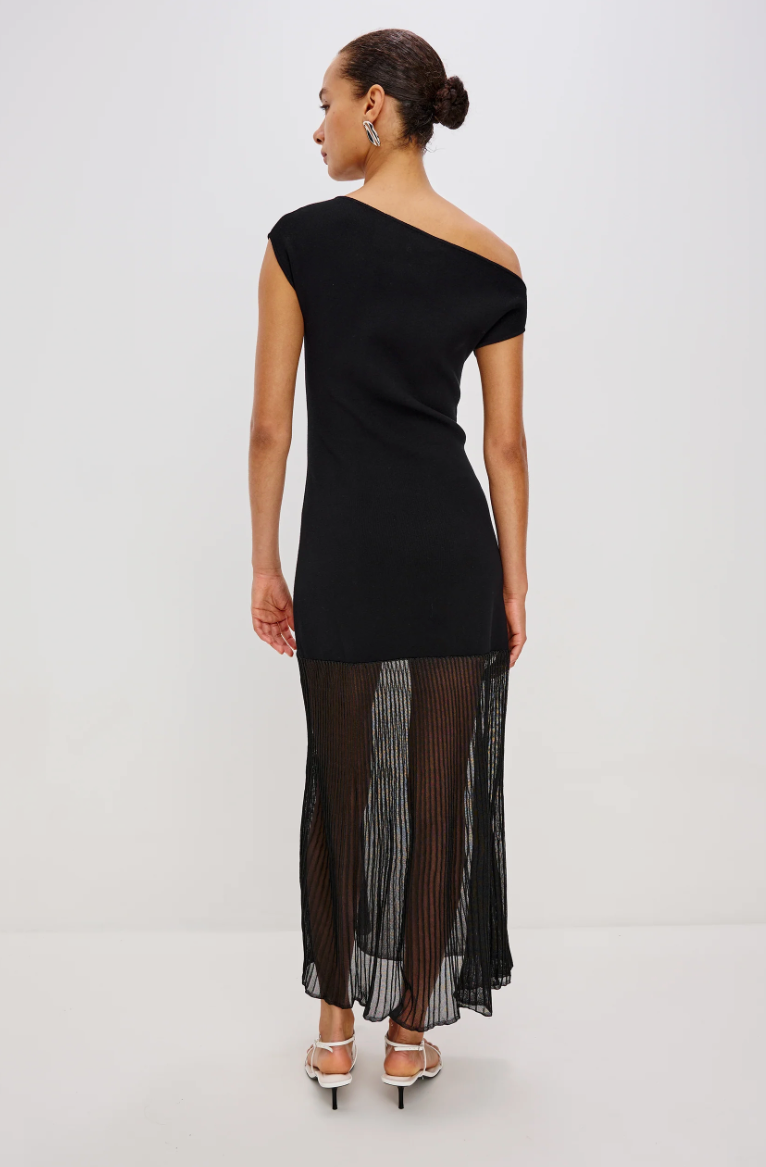 Effortlessly flattering from every angle, the Vinka is fitted from its elegantly shoulder-baring neckline through mid-thigh in sumptuous compact rib knit, then flows into a sheer pleated organza panel, finishing at a graceful midi hem