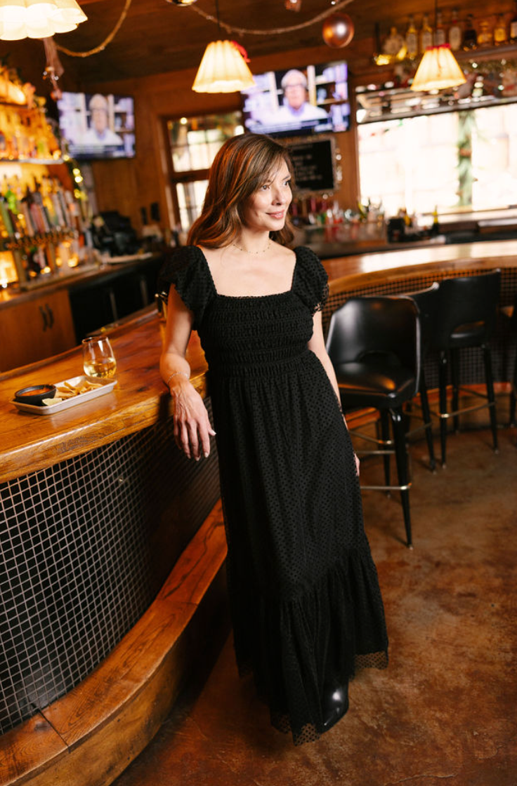 The Yarah Maxi Dress offers an elevated take on the classic black maxi with a striking geometric neckline and a structured bodice.