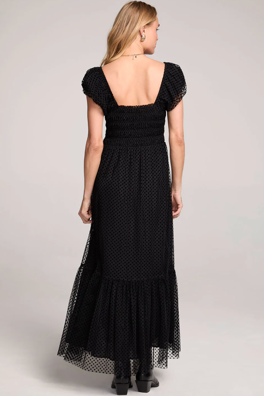 Its full skirt features a sheer overlay that gracefully catches the breeze, creating an elegant and timeless silhouette.